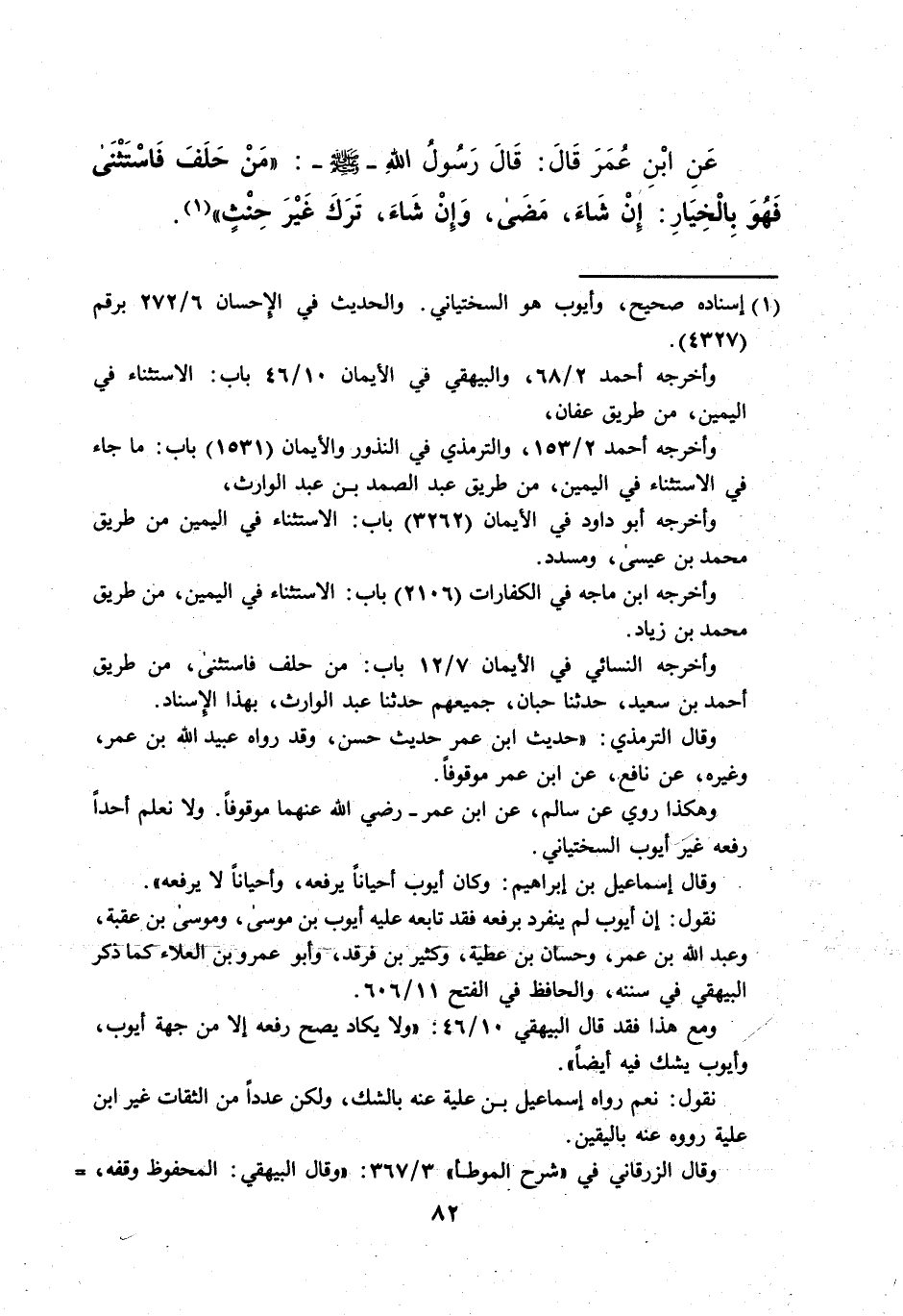 عَنِ ابْنِ عُمَرَ قَالَ: قَالَ رَسُولُ الله - صلى الله عليه وسلم -: "مَنْ حَلَفَ فَاسْتَثْنَى فَهُوَ بِالْخِيَارِ: إِنْ شاءَ، مَضَى، وَإِنْ شاءَ، تَرَكَ غير حِنْثٍ" (¬1).