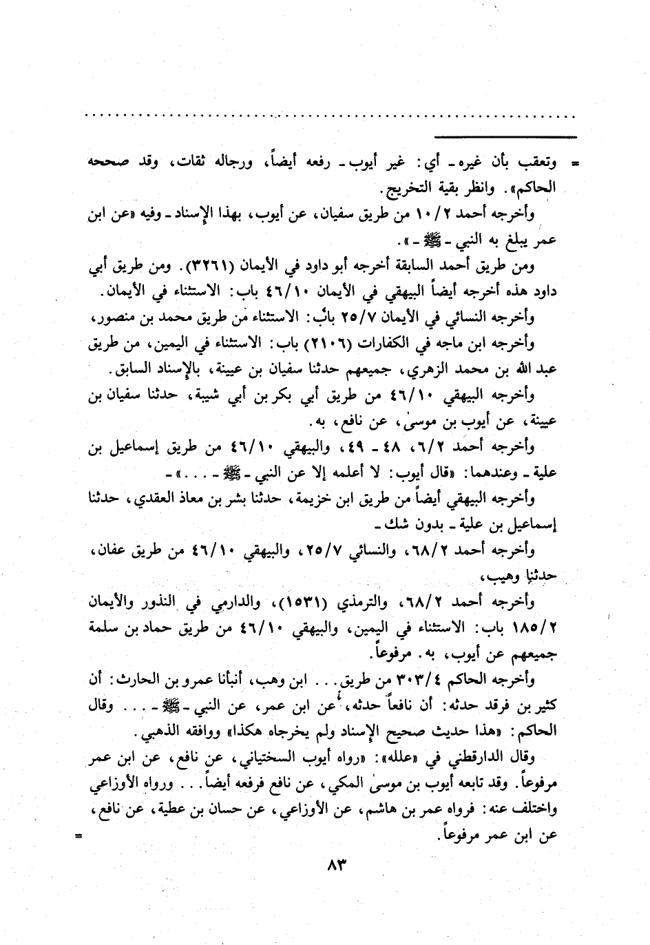 وأخرجه أحمد 2/ 68، والترمذي (1531)، والدارمىٍ في النذور والأيمان 2/ 185 باب: الاستئناء في اليمين، والبيهقي 10/ 46 من طريق حماد بن سلمة جميعهم عن أيوب، به. مرفوعاً.
