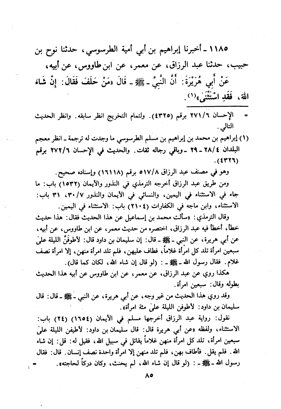 وقال الترمذي: "سألت محمد بن إسماعيل عن هذا الحديث فقال: هذا حديث خطأ، أخطأ فيه عبد الرزاق، اختصره من حديث معمر، عن ابن طاووس، عن أبيه، عن أبي هريرة، عن النبي - صلى الله عليه وسلم -قال: إن سليمان بن داود قال: لأطوفَنَّ الليلة على سبعين امرأة تلد كل امرأة غلاماً، فطاف عليهن، فلم تلد امرأة منهن، إلا امرأة نصف غلام. فقال رسول الله - صلى الله عليه وسلم -: (لو قال إن شاء الله، لكان كما قال). هكذا روي عن عبد الرزاق، عن معمر، عن ابن طاووس عن أبيه هذا الحديث بطوله وقال: سبعين امرأة.