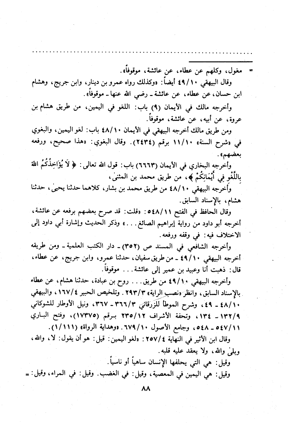 ومن طريق مالك أخرجه البيهقي في الأيمان 10/ 48 باب: لغو اليمين، والبغوي في "شرح السنة" 10/ 11 برقم (2434). وقال البغوي: "هذا صحيح، ورفعه بعضهم".