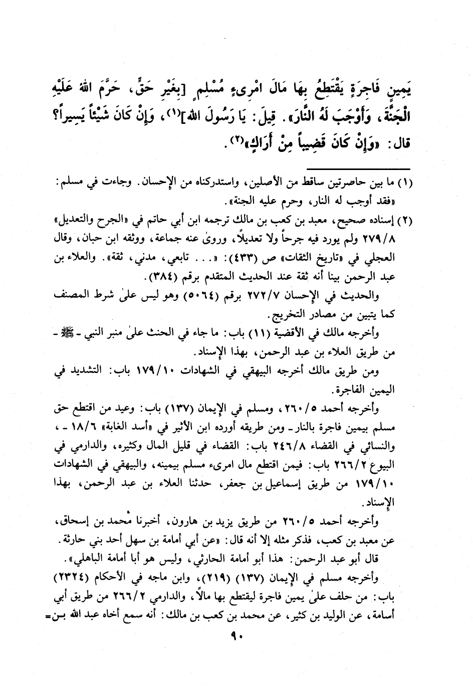 يَمِينٍ فَاجِرَةٍ يَقْتَطِعُ بهَا مَالَ امْرِىء مُسْلِمٍ [بِغَيْرِ حَقٍّ، حَرَّمَ الله عَلَيْهِ الْجَنَّةَ، وَأَوْجَبَ لَهُ النَارَ". قِيلَ: يَارسول الله] (¬1)، وَإِنْ كَانَ شَيْئاً يَسِيراً؟ قال: "وَإِنْ كَانَ قَضِيباً مِنْ أَرَاكٍ" (¬2).