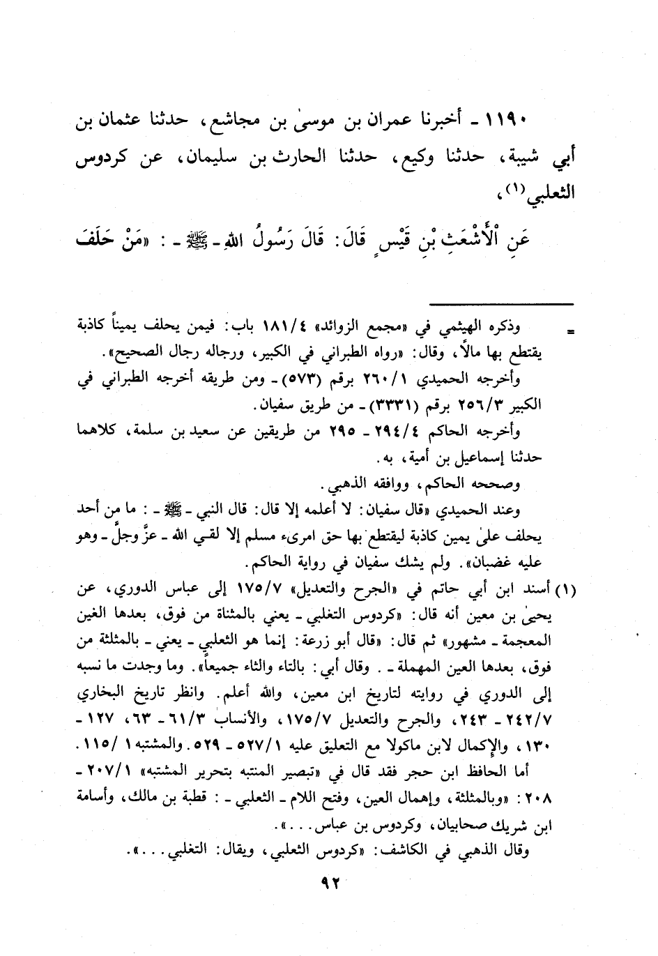 1190 - أخبرنا عمران بن موسى بن مجاشع، حدثنا عثمان بن أبي شيبة، حدثنا وكيع، حدثنا الحارث بن سليمان، عن كردوس الثعلبي (¬1)،