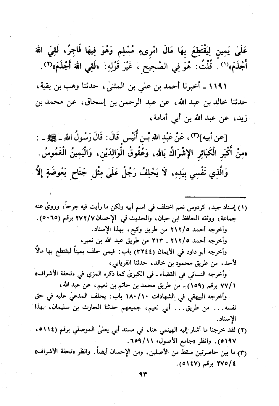 عَلَى يَمِينٍ لِيَقْتَطِعَ بِهَا مَالَ امْرِىءٍ مُسْلِم وَهُوَ فِيهَا فَاجِرٌ، لَقِيَ اللهَ أجْذَمَ" (¬1). قُلْتُ: هُوَ فِي الصّحِيحِ، غَيْرَ قَوْلهِ: " لَقِي اللهَ أَجْذَمَ" (¬2).