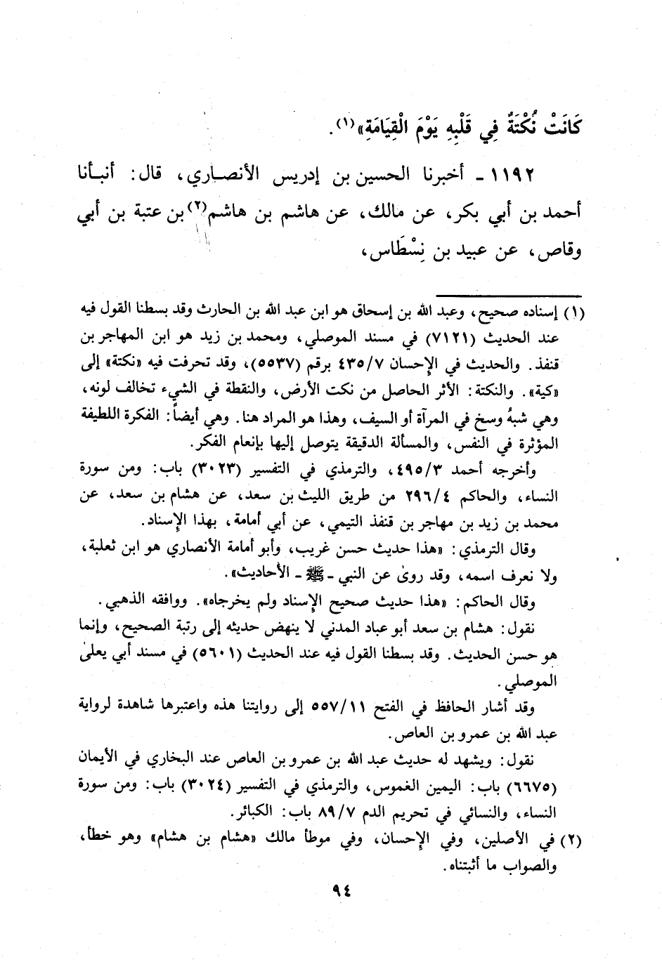 (¬1) إسناده صحيح، وعبد الله بن إسحاق هو ابن عبد الله بن الحارث وقد بسطنا القول فيه عند الحديث (7121) في مسند الموصلي، ومحمد بن زيد هو ابن المهاجر بن قنفذ. والحديث في الإحسان 7/ 435 برقم (5537)، وقد تحرفت فيه "نكتة" إلى "كية". والنكتة: الأثر الحاصل من نكت الأرض، والنقطة في الشيء تخالف لونه، وهي شبهُ وسخ في المرآة أو السيف، وهذا هو المراد هنا. وهي أيضاً: الفكرة اللطيفة المؤثرة في النفس، والمسألة الدقيقة يتوصل إليها بإنعام الفكر.