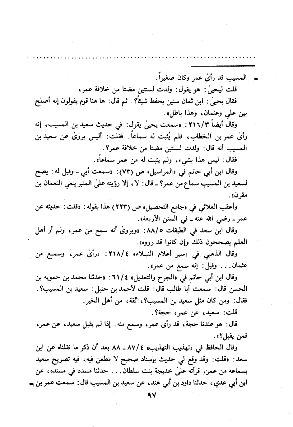 وقال أيضاً 3/ 216: "سمعت يحيى يقول: في حديث سعيد بن المسيب، إنه رأى عمر بن الخطاب، فلم يُثبت له سماعاً. فقلت: أليس يروى عن سعيد بن المسيب أنه قال: ولدت لسنتين مضتا من خلافة عمر؟. فقال: ليس هذا بشيء، ولم يثبت له من عمر سماعاً".