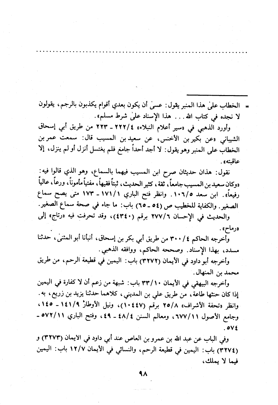 نقول: هذان حديثان صرح ابن المسيب فيهما بالسماع، وهو الذي قالوا فيه: "وكان سعيد بن المسيب جامعاً، ثقة، كثير الحديث، ثبتاً فقيهاً، مفتياً مأموناً، ورعاً، عالياً رفيعاً". ابن سعد 5/ 106. وانظر فتح الباري 1/ 171 - 173 متى يصح سماع الصغير. والكفاية للخطيب ص (54 - 65) باب: ما جاء في صحة سماع الصغير.