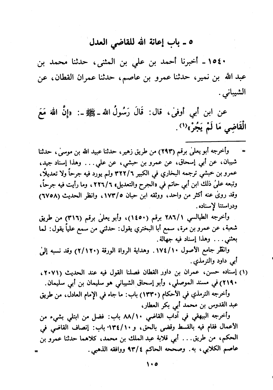 1540 - أخبرنا أحمد بن علي بن المثنى، حدثنا محمد بن بن عبد الله بن نمير، حدثنا عمرو بن عاصم، حدثنا عمران القطان، عن الشيباني. عن ابن أبي أوفى، قال: قَالَ رَسُولُ الله -صلى الله عليه وسلم-: "إِنَّ اللهَ مَعَ الْقَاضِي مَا لَمْ يَجُرْ" (¬1).