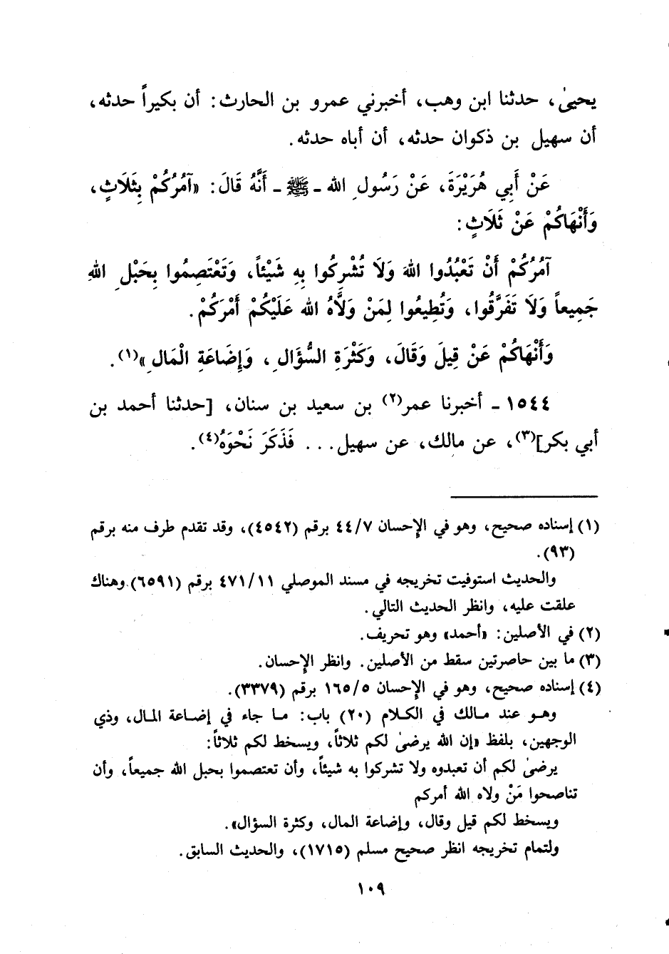 يحيى، حدثنا ابن وهب، أخبرني عمرو بن الحارث: أن بكيراً حدثه، أن سهيل بن ذكوان حدثه، أن أباه حدثه. عَنْ أَبِي هُرَيْرَةَ، عَنْ رَسُولِ الله -صلى الله عليه وسلم- أَنهُ قَالَ: "آمُرُكُمْ بِثَلاَثٍ، وأَنْهَاكُمْ عَنْ ثَلاثٍ: آمُرُكُمْ أنْ تَعْبُدُوا اللهَ وَلا تُشْرِكُوا بِهِ شَيْئاً، وَتَعْتَصِمُوا بِحَبْلِ اللهِ جَمِيعاً وَلا تَفَرَّقُوا، وَتُطِيعُوا لِمَنْ وَلاَّهُ الله عَلَيْكُمْ أَمْرَكُمْ. وأَنْهَاكُمْ عَنْ قِيلَ وَقَالَ، وَكَثْرَةِ السُّؤَالِ، وَإِضَاعَةِ الْمَالِ" (¬1).