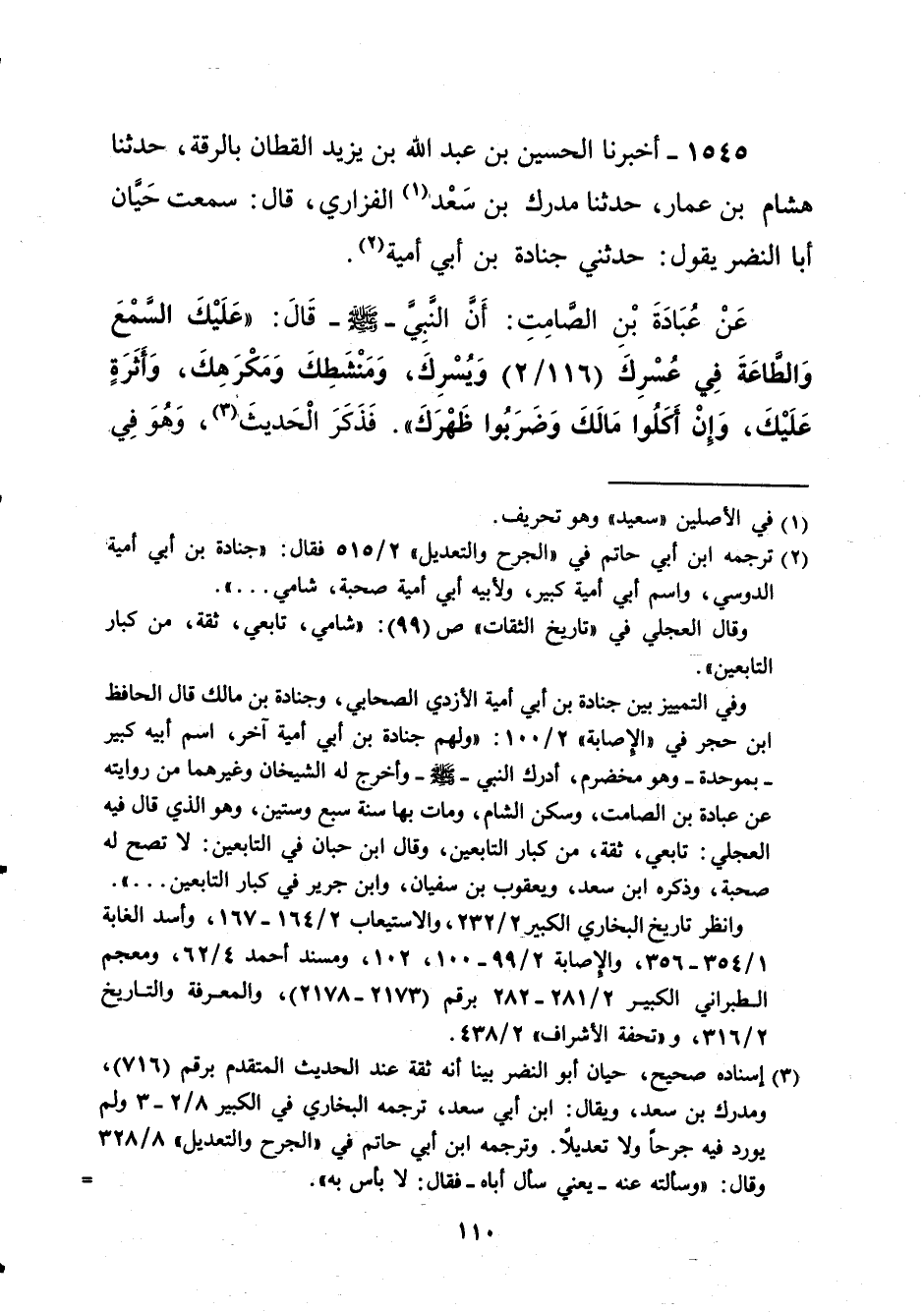 1545 - أخبرنا الحسين بن عبد الله بن يزيد القطان بالرقة، حدثنا هشام بن عمار، حدثنا مدرك بن سَعْد (¬1) الفزاري، قال: سمعت حَيَّان أبا النضر يقول: حدثني جنادة بن أبي أمية (¬2). عَنْ عُبَادَةَ بْنِ الصَّامت: أَنَّ النَّبِيّ -صلى الله عليه وسلم- قَالَ: "عَلَيْكَ السَّمْعَ وَالطَّاعَةَ فِي عُسْرِكَ (116/ 2) وَيُسْرِكَ، وَمَنْشَطِكَ وَمَكْرَهِكَ، وَأَثَرَةٍ عَلَيْكَ، وَإنْ أكَلُوا مَالَكَ وَضَرَبُوا ظَهْرَكَ". فَذَكَرَ الْحَديثَ (¬3)، وَهُوَ فِي