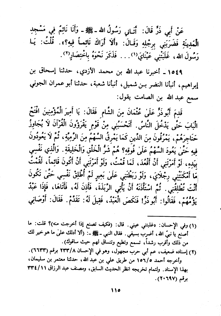 1549 - أخبرنا عبد الله بن محمد الأزدي، حدثنا إسحاق بن إبراهيم، أنبأنا النضر بن شميل، أنبأنا شعبة، حدثنا أبو عمران الجوني سمع عبد الله بن الصامت يقول: قَدِمَ أَبُو ذَرٍّ عَلَى عُثْمَانَ مِنَ الشَّامِ فَقَالَ: يَا أَمِيرَ الْمُؤْمِنِينَ افْتَحْ الْبَابَ حَتّى يَدْخُلَ النَّاسُ. أَتَحْسَبُنِي مِنْ قَوْم يَقْرَؤُونَ الْقُرْآنَ لا يُجَاوِزُ حَنَاجِرهُمْ، يَمْرُقُونَ مِنَ الدينِ كَمَا يَمْرِقُ السهم مِنَ الرَّميَّة، ثُمَّ لا يَعُودُونَ فِيهِ حَتى يَعُودَ السَّهْمُ عَلَى فُوقِهِ؟ هُمْ شَرُّ الْخَلْقِ وَالْخَلِيقَةِ. وَالذِي نَفْسِي بِيَدِهِ". لَوْ أَمَرْتَنِي أَنْ أَقْعُدَ، لَمَا قُمْتُ، وَلَوْ أَمَرْتَنِي أَنْ أَكُونَ قَائِماً، لَقُمْتُ مَا أَمْكَنتنِي رِجْلايَ، وَلَوْ رَبَطْتَنِي عَلَى بَعِيرٍ لَمْ أُطْلِقْ نَفْسِي حَتى تَكُونَ أنتَ تُطْلِقُنِي. ثُم اسْتَاْذَنَهُ أَنْ يَأْتِي الرَّبَذَة، فَأَذِنَ لَهُ، فَأَتَاهَا، فَإذَا عبد يَؤُمُّهُمْ، فَقَالُوا: أَبُو ذرٍّ! فَنَكَصَ الْعَبْدُ، فَقِيلَ لَهُ: تقدم. فَقَالَ: أَوْصَانِي