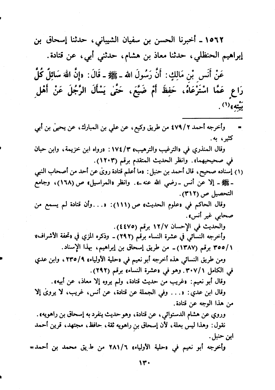 1562 - أخبرنا الحسن بن سفيان الشيباني، حدثنا إسحاق بن إبراهيم الحنظلي، حدثنا معاذ بن هشام، حدثني أبي، عن قتادة. عَنْ أَنَسِ بْنِ مَالِكٍ: أَنَّ رسول الله -صلى الله عليه وسلم- قَالَ: " إِنَّ اللهَ سَائِلٌ كُلَّ رَاعٍ عمَّا اسْتَرْعَاهُ، حَفِظَ أمْ ضَيَّعَ، حَتى يسْألَ الرَّجُلَ عَنْ أهْلِ بَيْتِهِ" (¬1).