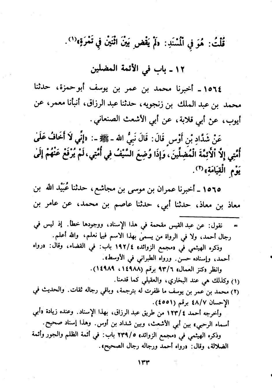 1564 - أخبرنا محمد بن عمر بن يوسف أبو حمزة، حدثنا محمد بن عبد الملك بن زنجويه، حدثنا عبد الرزاق، أنبأنا معمر، عن أيوب، عن أبي قلابة، عن أبي الأشعث الصنعاني. عَنْ شدَّاد بْنِ أَوْس قَالَ: قَالَ نَبِيُّ الله -صلى الله عليه وسلم-:"إنِّي لا أَخَافُ عَلَى أُمَّتِي إلاَّ الأَئِمَّة المضلِّين، وَإِذَا وُضِعَ السَّيْفُ فِي أمَّتي، لَمْ يُرْفَعْ عَنْهُمْ إِلَى يَوْمَ الْقِيَامَةِ" (¬2).