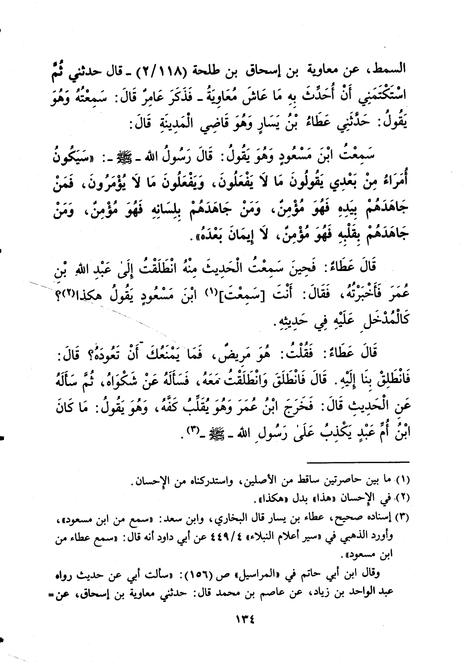 السمط، عن معاوية بن إسحاق بن طلحة (118/ 2) - قال حدثني "ثمَّ اسْتَكْتَمَنِي أَنْ أُحَدَّثَ بِهِ مَا عَاشَ مُعَاوِيةُ- فَذَكَرَ عَامِرٌ قَالَ: سَمِعْتُهُ وَهُوَ يَقُولُ: حدَّثنى عَطَاءُ بْنُ يَسَارٍ وَهُوَ قَاضِي الْمَدِينَةِ قَالَ: سَمِعْتُ ابْنَ مَسْعُودٍ وَهُوَ يَقُولُ: قَالَ رَسُولُ الله -صلى الله عليه وسلم-: "سَيَكُونُ أُمَرَاءُ مِنْ بَعْدِي يَقُولُونَ مَا لاَ يَفْعَلُونَ، وَيَفْعَلُونَ مَا لاَ يُؤْمَرُونَ، فَمَنْ جَاهَدَهُمْ بِيَدِهِ فَهُوَ مُؤْمِنٌ، وَمَنْ جَاهَدَهُمْ بِلِسَانِهِ فَهُوَ مُؤْمِنٌ، وَمَنْ جَاهَدَهُمْ بِقَلْبِهِ فَهُوَ مُؤْمِنٌ، لا إِيمَانَ بَعْدَهُ". قَالَ عَطَاءٌ: فَحِينَ سَمِعْتُ الْحَدِيثَ مِنْهُ انْطَلَقْتُ إِلَى عَبْدِ اللهِ بْنِ عُمَرَ فَأَخْبَرْتُهُ، فَقَالَ: أَنْتَ [سَمِعْتَ] (¬1) ابْنَ مَسْعُودٍ يَقُولُ هكذا (¬2)؟ كَالْمُدْخَلِ عَلَيْهِ فِي حَدِيثِهِ. قَالَ عَطَاءٌ: فَقُلْتُ: هُوَ مَرِيضٌ، فَمَا يَمْنَعُكَ أَنْ تَعُودَهُ؟ قَالَ: فَانْطَلِقْ بِنَا إِلَيْهِ. قَالَ فَانْطَلَقَ وَانْطَلَقْتُ مَعَهُ، فَسَأَلَهُ عَنْ شَكْوَاهُ، ثُمَّ سَأَلَهُ عَنِ الْحَدِيثِ قَالَ: فَخَرَجَ ابْنُ عُمَرَ وَهُوَ يُقَلِّبُ كَفَّهُ، وَهُوَ يَقُولُ: مَا كَانَ ابْنُ أُمِّ عَبْدٍ يَكْذِبُ عَلَى رَسُولِ الله -صلى الله عليه وسلم- (¬3).