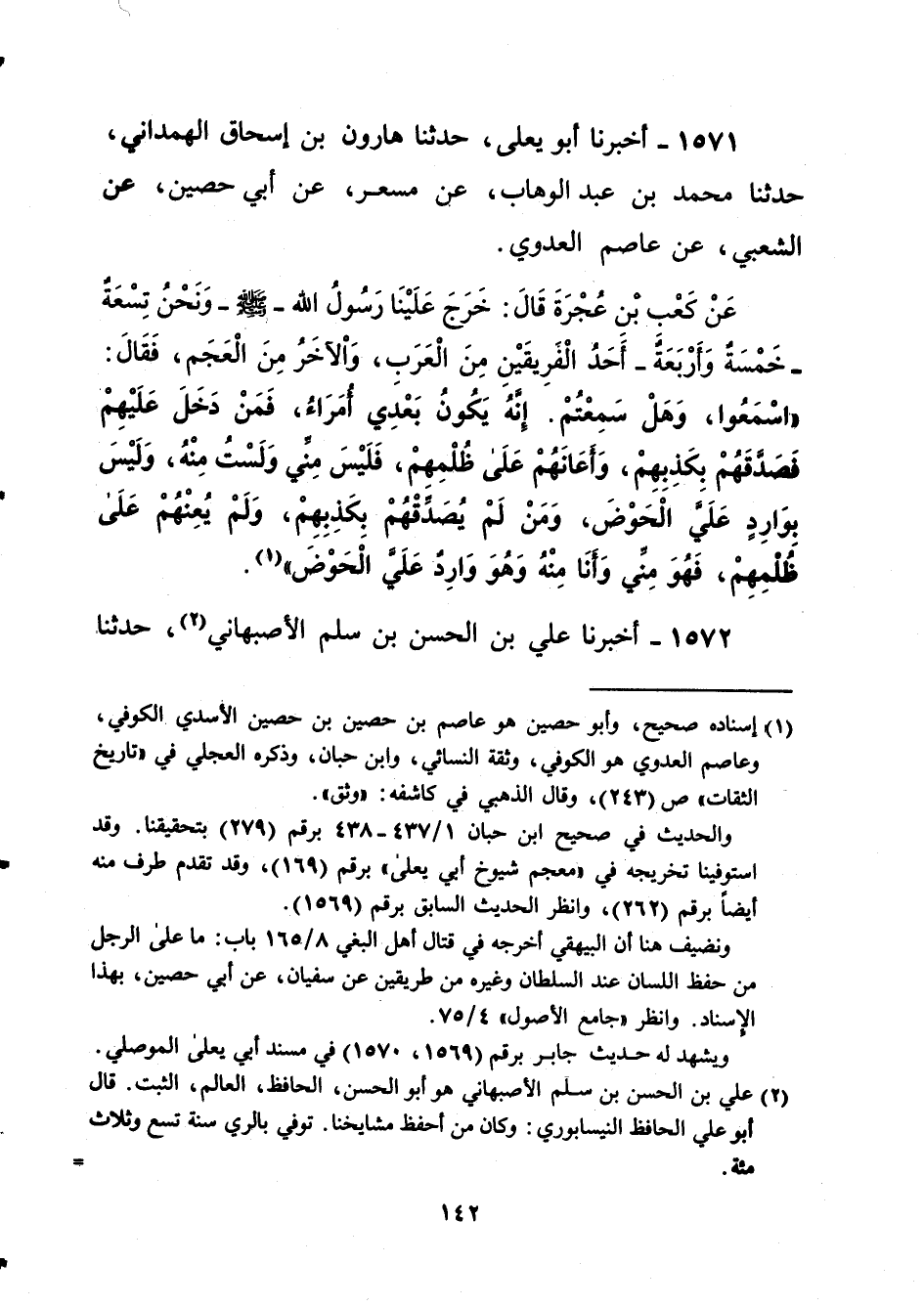 1571 - أخبرنا أبو يعلى، حدثنا هارون بن إسحاق الهمداني، حدثنا محمد بن عبد الوهاب، عن مسعر، عن أبي حصين، عن الشعبي، عن عاصم العدوي. عَنْ كَعْبِ بْنِ عُجْرَةَ قَالَ: خَرَجَ عَلَيْنَا رَسُولُ الله -صلى الله عليه وسلم- وَنَحْنُ تِسْعَةٌ - خَمْسَةٌ وَأَرْبَعَةٌ - أَحَدُ الْفرِيقَيْنِ مِنَ الْعَرَبِ، وَاْلآخَرُ مِنَ الْعَجَم، فَقَالَ: "اسْمَعُوا، وَهَلْ سمعتم. إنّهُ يَكُونُ بَعْدِي أمَرَاءُ، فَمَنْ دَخَلَ عَلَيْهِمْ فصدقهم بِكَذِبِهِمْ، وَأعَانَهُمْ عَلَى ظُلْمِهِمْ، فَلَيْسَ مِنِّي وَلَسْتُ مِنْهُ، وَلَيْسَ بوَارِدٍ عَلَيّ الْحَوْضَ، وَمَنْ لَمْ يصدِّقهمْ بِكَذِبِهِمْ، وَلَمْ يُعِنْهُمْ عَلَى ظُلْمهم، فَهُوَ مِنِّي وَأَنَا مِنْهُ وَهُوَ وَارِدٌ عَلَيَّ الْحَوْضَ" (¬1).