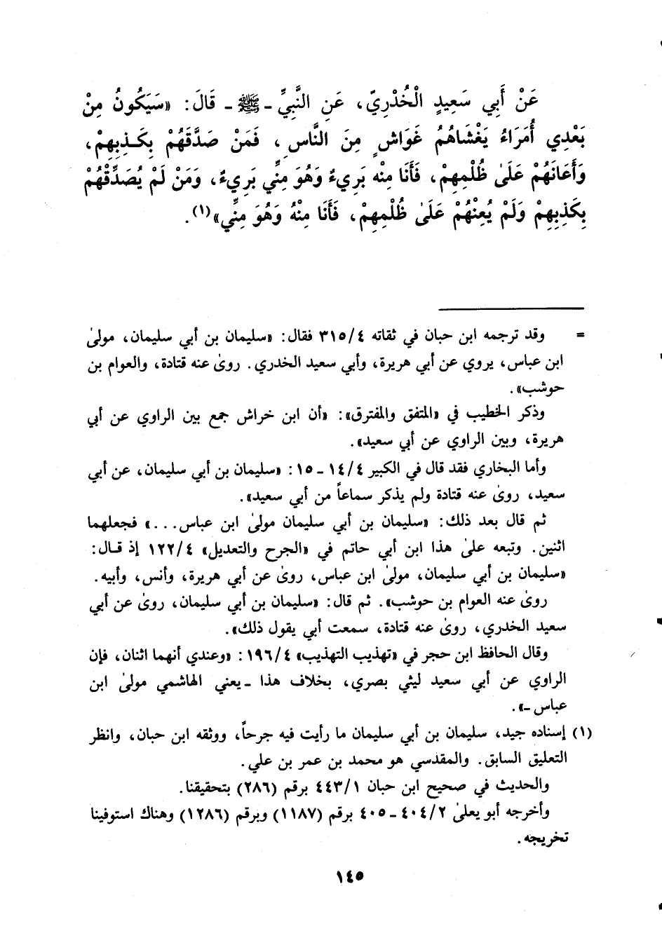 عَنْ أَبِي سَعِيدٍ الْخُدْرِيّ، عَنِ النَّبِيِّ -صلى الله عليه وسلم- قَالَ: "سَيَكُونُ مِنْ بَعْدِي أُمَرَاءُ يَغْشَاهُمُ غَوَاشٍ مِنَ النَّاسِ، فَمَنْ صَدَّقَهُمْ بِكَذِبهِمْ، وَأعَانَهُمْ عَلَى ظُلْمِهِمْ، فَأَنَا مِنْه بَرِيءٌ وَهُوَ مِنِّي بَرِيءٌ، وَمَنْ لَمْ يُصَدِّقْهُمْ بِكَذِبِهِمْ وَلَمْ يُعِنْهُمْ عَلَى ظُلْمِهِمْ، فأنا مِنْهُ وَهُوَ مِنَّي" (¬1).