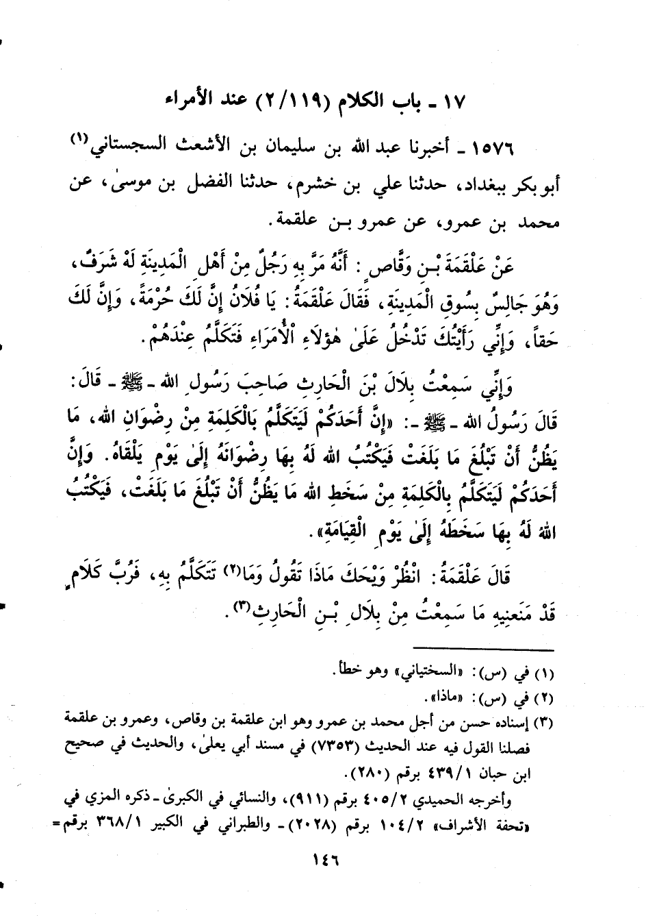 1576 - أخبرنا عبد الله بن سليمان بن الأشعث السجستاني (¬1) أبو بكر ببغداد، حدثنا علي بن خشرم، حدثنا الفضل بن موسى، عن محمد بن عمرو، عن عمرو بن علقمة. عَنْ عَلْقَمَةَ بْنِ وَقَّاصٍ: أَنَّهُ مَرَّ بِهِ رَجُلٌ مِنْ أَهْلِ الْمَدِينَةِ لَهْ شَرَفٌ، وَهُوَ جالسٌ بِسُوقِ الْمَدِينَةِ، فَقَالَ عَلْقَمَةُ: يَا فُلانُ إِنَّ لَكَ حُرْمَةً، وَإِنَّ لَكَ حَقاً، وَإِنِّي رَأَيْتُكَ تَدْخلُ عَلَى هؤلاءِ الأمَرَاءِ فَتَكَلَّمُ عندهم. وَإنِّي سَمِعْتُ بِلالَ بْنَ الْحَارِثِ صَاحِبَ رَسُولِ الله -صلى الله عليه وسلم- قَالَ: قَالَ رَسُول الله -صلى الله عليه وسلم-:" إِنَّ أَحَدَكُمْ لَيتَكَلَّمُ بَالْكَلِمَةِ مِنْ رِضْوَانِ الله، مَا يَظُنُّ أَنْ تبلغ مَا بَلَغَتْ فَيَكْتُبُ الله لَهُ بِهَا رِضْوَانَهُ إِلَى يَوْم يَلْقَاهُ. وَإنَّ أَحَدَكُمْ لَيَتَكَلَّمُ بِالْكَلِمَةِ مِنْ سَخَطِ الله مَا يَظُنُّ أَنْ تبلغ مَا بَلَغَتْ، فَيَكْتُبُ اللهُ لَهُ بِهَا سَخَطَهُ إِلَى يَوْمِ الْقِيَامَةِ". قَالَ عَلْقَمَةُ: انْظُرْ ويحَكَ مَاذَا تَقولُ وَمَا (¬2) تَتَكَلَّمُ بِهِ، فَرُبَّ كَلام قَدْ مَنَعنِيهِ مَا سَمِعْتُ مِنْ بِلالِ بْنِ الْحَارِثِ (¬3).