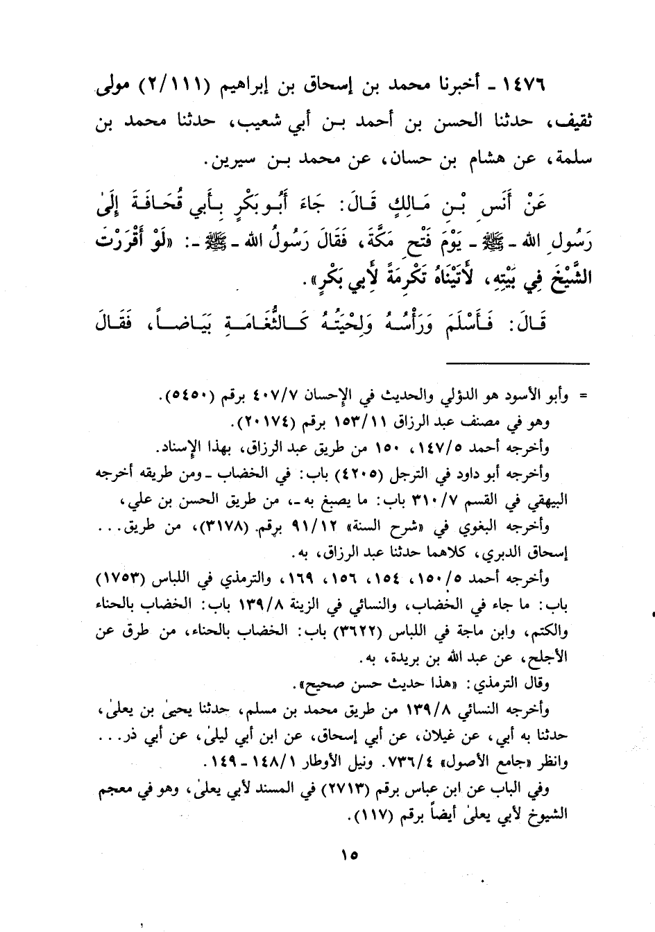 1476 - أخبرنا محمد بن إسحاق بن إبراهيم (111/ 2) مولى، ثقيف، حدثنا الحسن بن أحمد بن أبي شعيب، حدثنا محمد بن سلمة، عن هشام بن حسان، عن محمد بن سيرين. عَنْ أَنَسِ بْنِ مَالِكٍ قَالَ: جَاءَ أَبُو بَكْرٍ بِأَبي قُحَافَةَ إِلَى رَسُولِ الله - صلى الله عليه وسلم - يَوْمَ فَتْحِ مَكَّةَ، فَقَالَ رَسُولُ الله - صلى الله عليه وسلم -: "لَوْ أَقْرَرْتَ الشَّيْخَ فِي بَيْتِهِ، لأتَيْنَاهُ تَكْرِمَةً لأِبي بَكْرٍ". قَالَ: فَأسْلَمَ وَرَأْسُهُ وَلِحْيَتُهُ كَالثغَامَةِ بَيَاضاً، فَقَالَ