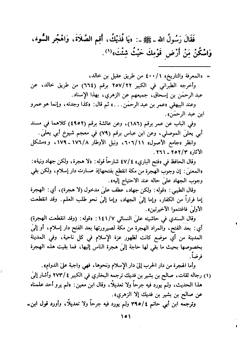 وقال الحافظ في "فتح الباري" 4/ 47 شارحاً قوله: "لا هجرة" ولكن جهاد ونية": "المعنى: إن وجوب الهجرة من مكة انقطع بفتحها إذ صارت دار إسلام، ولكن بقي وجوب الجهاد على حاله عند الاحتياج إليه".