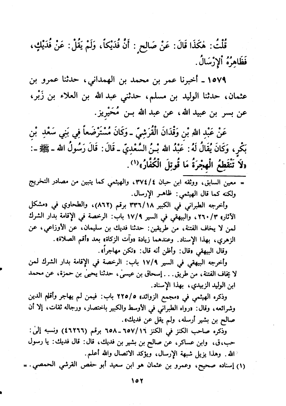 1579 - أخبرنا عمر بن محمد بن الهمداني، حدثنا عمرو بن عثمان، حدثنا الوليد بن مسلم، حدثني عبد الله بن العلاء بن زَبْر، عن بسر بن عبيد الله، عن عبد الله بن مُحَيْرِيز. عَنْ عَبْدِ اللهِ بْنِ وَقْدَانَ الْقُرَشِيّ- وَكَانَ مُسْتَرْضَعاً فِي بَنِي سَعْدِ بْنِ بَكْرٍ، وَكَانَ يُقَالُ لَهُ: عَبْدُ الله بْنُ السَّعْدِيّ- قَالَ: قَالَ رَسُولُ الله -صلى الله عليه وسلم-: "لا تَنْقَطِعُ الهجرةُ مَا قُوتِلَ الْكُفَّارُ" (¬1).