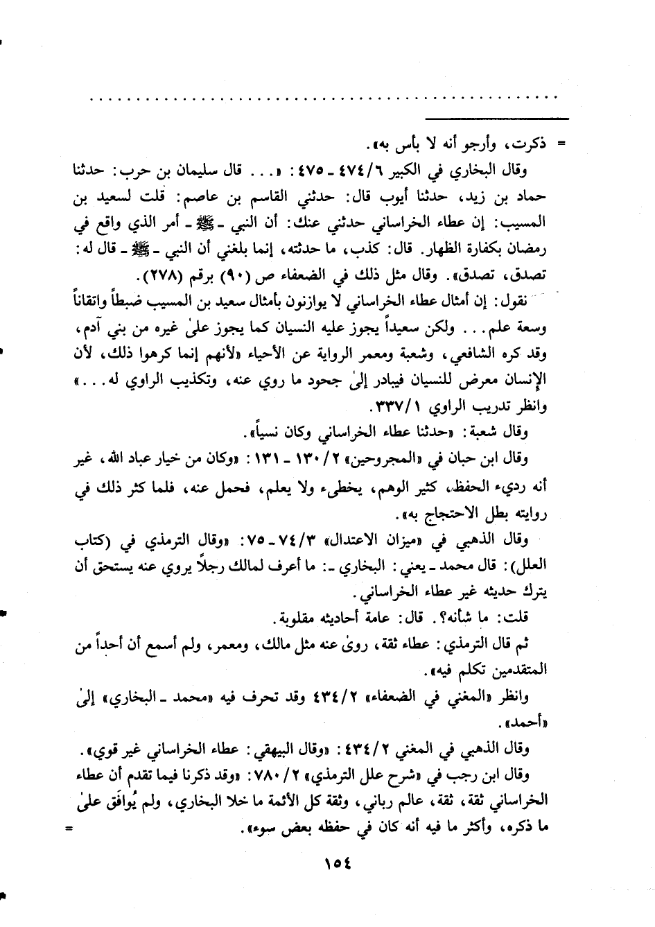 وقال البخاري في الكبير 6/ 474 - 475: " ... قال سليمان بن حرب: حدثنا حماد بن زيد، حدثنا أيوب قال: حدثني القاسم بن عاصم: قلت لسعيد بن المسيب: إن عطاء الخراساني حدثني عنك: أن النبي -صلى الله عليه وسلم- أمر الذي واقع في رمضان بكفارة الظهار. قال: كذب، ما حدثته، إنما بلغني أن النبي -صلى الله عليه وسلم- قال له: تصدق، تصدق". وقال مثل ذلك في الضعفاء ص (90) برقم (278).