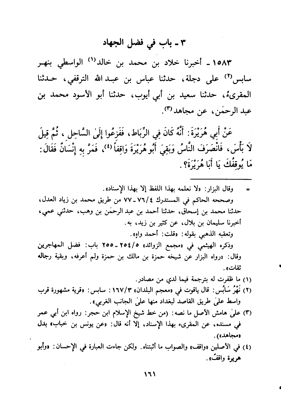 1583 - أخبرنا خلاد بن محمد بن خالد (¬1) الواسطي بنهر سابس (¬2) على دجلة، حدثنا عباس بن عبد الله الترقفي، حدثنا المقرىءُ، حدثنا سعيد بن أبي أيوب، حدثنا أبو الأسود محمد بن عبد الرحمن، عن مجاهد (¬3). عَنْ أَبِي هُرَيْرَةَ: أَنَّهُ كَانَ فِي الرِّبَاط، فَفَزِعُوا إِلَى السَّاحِلِ، ثُمَّ قِيلَ لا بَأْسَ، فَانْصَرَفَ النَّاسُ وَبَقِيَ أَبُو هُرَيْرَةَ وَاقِفاً (¬4)، فَمَرَّ بِهِ إِنْسَانٌ فَقَالَ: مَا يُوقِفُكَ يَا أَبَا هُرَيْرَةَ؟.