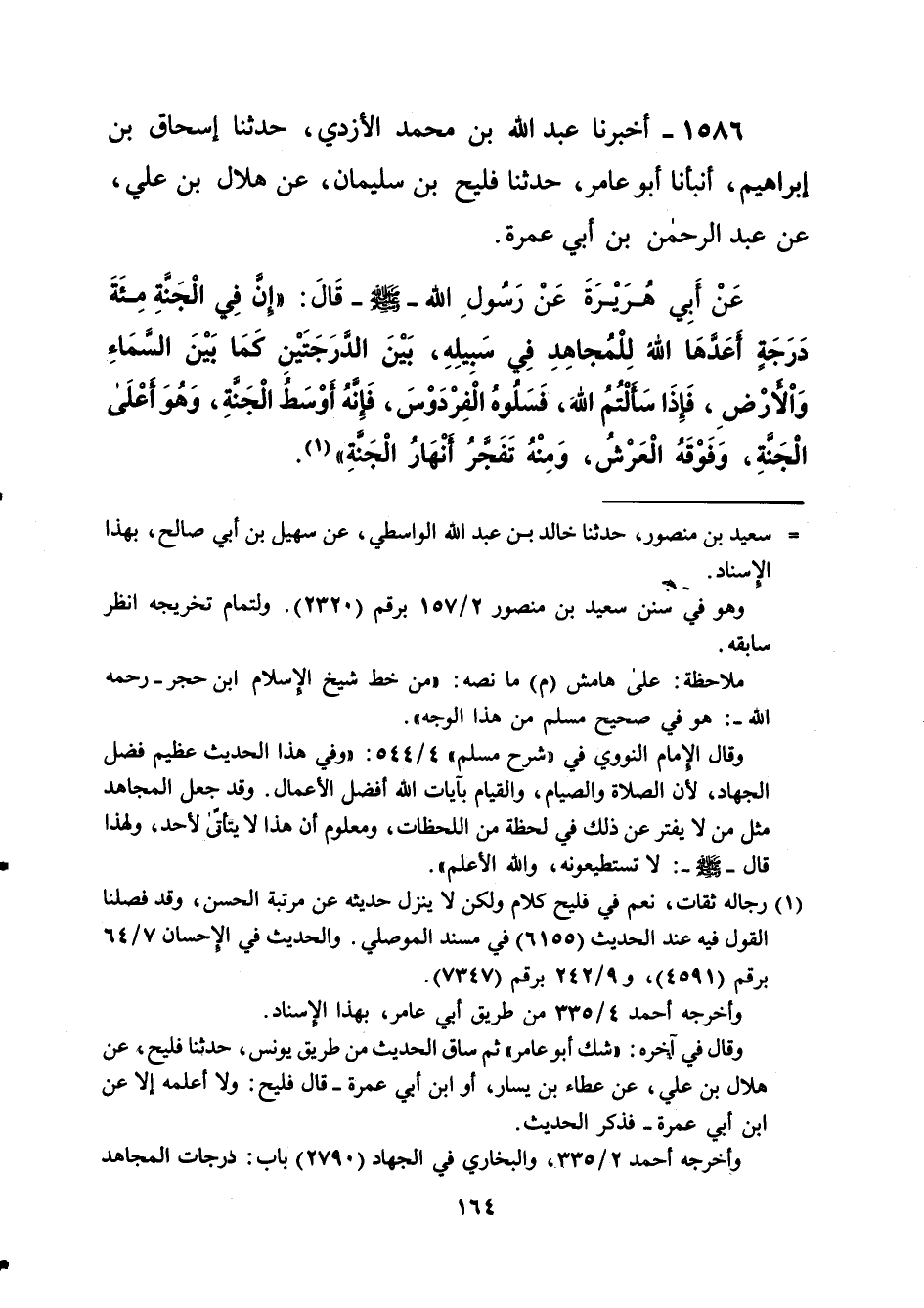 1586 - أخبرنا عبد الله بن محمد الأزدي، حدثنا إسحاق بن إبراهيم، أنبأنا أبو عامر، حدثنا فليح بن سليمان، عن هلال بن علي، عن عبد الرحمن بن أبي عمرة. عَنْ أَبِي هُرَيْرَةَ عَنْ رَسُولِ الله -صلى الله عليه وسلم- قَالَ: "إنَّ فِي الْجَنّةِ مِئَةَ دَرَجَةٍ أَعَدَّهَا الله لِلْمُجاهِدِ فِي سَبِيلِهِ، بَيْنَ الدُّرَجَتَيْنِ كَمَا بَيْنَ السماء وَاْلأرْضِ، فإذا سَأَلْتُمُ اللهَ، "فَسَلُوهُ الْفِرْدَوْسَ، فَإنهُ أوْسَطُ الْجَنُّةِ، وَهُوَ أعْلَى الْجَنّةِ، وَفَوْقَهُ الْعَرْشُ، وَمِنْهُ تَفَجُّرُ أَنْهَارُ الْجَنّةِ" (¬1).
