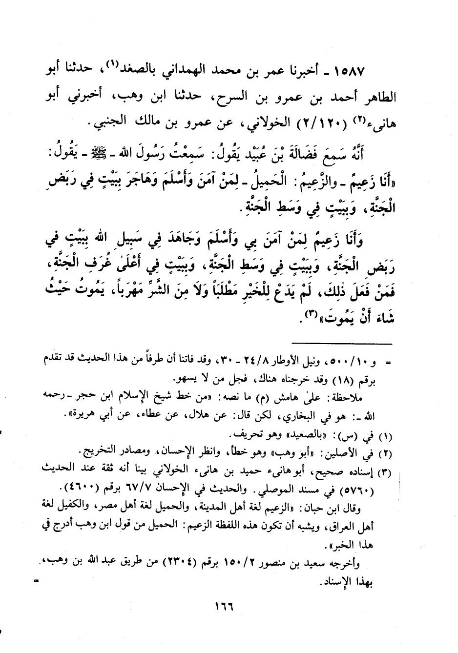 أَنَّهُ سَمعَ فَضَالَةَ بْنَ عُبَيْد يَقُولُ: سَمِعْتُ رسول الله -صلى الله عليه وسلم- يَقُولُ: "أَنَا زَعِيم- والزَّعِيمُ: الْحَمِيلُ- لِمَنْ آمَنَ وَأَسْلَمَ وَهَاجَرَ بِبَيْتٍ فِي رَبَض الْجَنّةِ، وَبِبَيْتٍ فِي وَسَطِ الْجَنةِ. وَأَنَا زَعِيم لِمَنْ آمَنَ بِي وَأَسْلَمَ وَجَاهَدَ فِي سَبِيلِ الله بِبَيْتٍ في رَبَضِ الْجَنَّةِ، وَبِبَيْتٍ فِي وَسَطِ الْجَنَّةِ، وَبِبَيْتٍ فِي أَعْلَى غُرَفِ الْجَنَّةِ، فَمَنْ فَعَلَ ذلِكَ، لَمْ يَدَعْ لِلْخَيْرِ مَطْلَبَاً وَلا مِنَ الشَّرِّ مَهْرَباً، يَمُوتُ حَيْثُ شَاءَ أَنْ يَمُوتَ" (¬3).