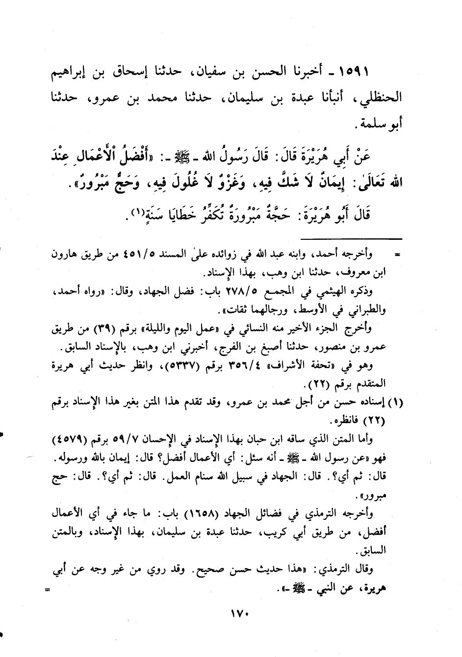 (¬1) إسناده حسن من أجل- محمد بن عمرو، وقد تقدم هذا المتن بغير هذا الإسناد برقم (22) فانظره. وإما المتن الذي ساقه ابن حبان بهذا الإِسناد في الإحسان 7/ 59 برقم (4579) فهو "عن رسول الله - صلى الله عليه وسلم- أنه سئل: أي الأعمال أفضل؟ قال: إيمان بالله ورسوله. قال: ثم أي؟. قال: الجهاد في سبيل الله سنام العمل. قال: ثم أي؟. قال: حج مبرور".