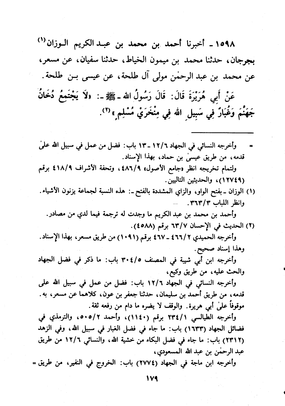 1598 - أخبرنا أحمد بن محمد بن عبد الكريم الوزان (¬1) بجرجان، حدثنا محمد بن ميمون الخياط، حدثنا سفيان، عن مسعر، عن محمد بن عبد الرحمن مولى آل طلحة، عن عيسى بن طلحة. عَنْ أَبِي هُرَيْرَةَ قَالَ: قَالَ رَسُولُ الله -صلى الله عليه وسلم-: " لا يَجْتَمعُ دُخَانُ جَهَنَّمَ وَغبارٌ فِي سَبِيلِ الله فِي مِنْخَرَيْ مُسْلِم" (¬2).