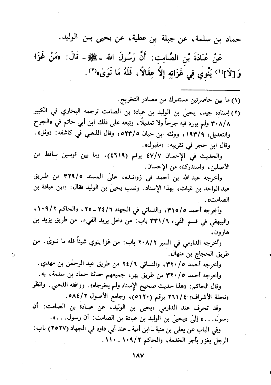 حماد بن سلمة، عن جبلة بن عطية، عن يحيى بن الوليد. عَنْ عُبَادَةَ بْنِ الصَّامِتِ: أَنَّ رسول الله -صلى الله عليه وسلم- قَالَ:"مَنْ غَزَا وَ [لاَ] (¬1) يَنْوِي فِي غَزَاتِهِ إِلاَّ عِقَالاً، فَلَهُ مَا نَوَى" (¬2).