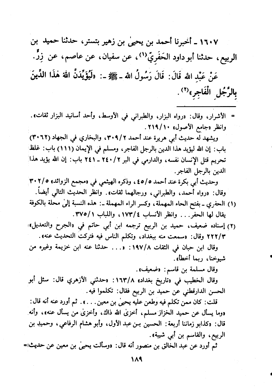 1607 - أخبرفا أحمد بن يحيى بن زهير بتستر، حدثنا حميد بن. الربيع، حدثنا أبو داود الحَفَرِيّ (¬1)، عن سفيان، عن عاصم، عن زِرٍّ. عَنْ عَبْدِ الله قَالَ: قَالَ رَسُول الله -صلى الله عليه وسلم-: "لَيُؤَيدَنَّ الله هذَا الدين بالرجل الْفَاجِرِ" (¬2).