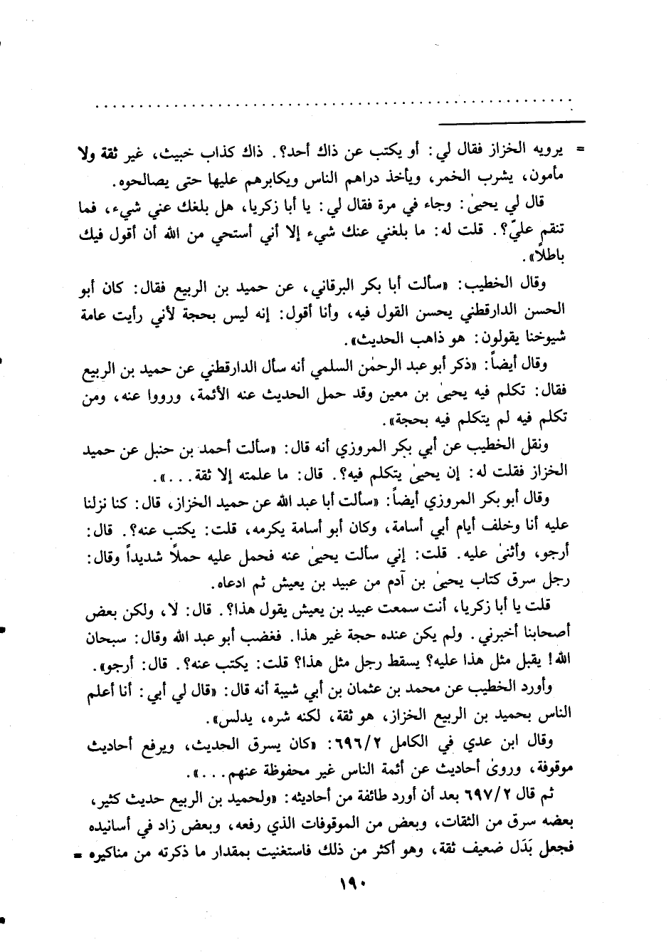 = يرويه الخزاز فقال لي: أو يكتب عن ذاك أحد؟. ذاك كذاب خبيث، غير ثقة ولا مأمون، يشرب الخمر، ويأخذ دراهم الناس ويكابرهم عليها حتى يصالحوه. قال لي يحيى: وجاء في مرة فقال لي: يا أبا زكريا، هل بلغك عني شيء، فما تنقمٍ عليّ؟. قلت له: ما بلغني عنك شيء إلا أني أستحي من الله أن أقول فيك باطلا".