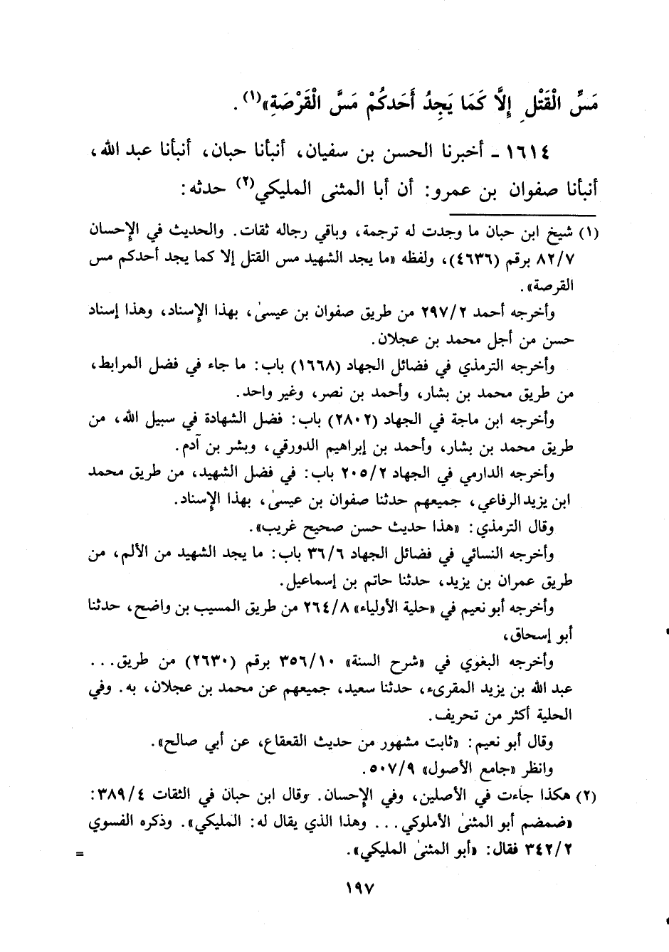 (¬1) شيخ ابن حبان ما وجدت له ترجمة، وباقي رجاله ثقات. والحديث في الإحسان 7/ 82 برقم (4636)، ولفظه" ما يجد الشهيد مس القتل الله كما يجد أحدكم مس القرصة".