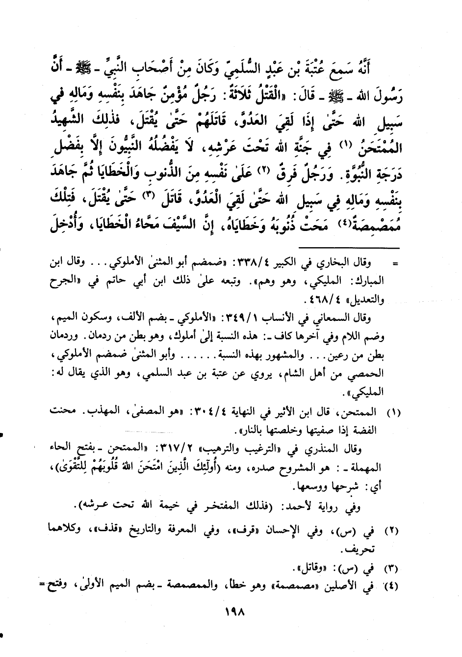 أَنَّهُ سَمعَ عُتْبَةَ بْن عَبْدٍ السُّلَمِيّ وَكَانَ مِنْ أَصْحَابِ النَّبِيّ -صلى الله عليه وسلم- أَنَّ رَسُولَ الله -صلى الله عليه وسلم- قَالَ: "الْقَتْلُ ثَلاَثةٌ: رَجُلٌ مُؤمِنٌ جَاهَدَ بِنَفْسِهِ وَمَالِهِ في سَبِيلِ الله حَتى إِذَا لَقِيَ العَدُوُّ، قَاتَلَهُمْ حَتى يُقْتَلَ، فذلِكَ الشَّهِيدُ المُمْتَحَنُ (¬1) فِي جَنَّة الله تَحْتَ عَرْشِهِ، لا يَفْضُلُهُ النَّبيُّون إِلاَّ بِفَضْل دَرَجَةِ النُّبُوَّةِ. وَرَجُلٌ فَرِقٌ (¬2) عَلَى نَفْسِهِ مِنَ الذُّنوب وَالْخَطَايَا ثُمَّ جَاهَدَ بِنَفْسِهِ وَمَالِهِ فِي سَبِيلِ الله حَتَّى لَقِيَ الْعَدُوَّ، قَاتَلَ (¬3) حَتى يُقْتَلَ، فَتِلْكَ مُمَصْمِصَةٌ (¬4) مَحَتْ ذُنُوبَهُ وَخَطَايَاهُ، إِنَّ السَّيف مَحَّاءُ الْخَطَايَا، وَأُدْخِلَ