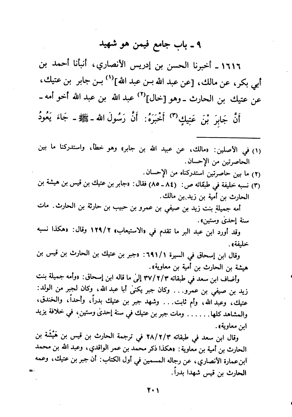 1616 - أخبرنا الحسن بن إدريس الأنصاري، أنبأنا أحمد بن أبى بكر، عن مالك، [عن عبد الله بن. عبد الله] (¬1) بن جابر بن عتيك، عتيك بن الحارث- وهو [خال] (¬2) عبد الله بن عبد الله أخو أمه- أَنَّ جَابِرَ بْنَ عَتِيكٍ (¬3) أَخْبَرَهُ: أَنَّ رسول الله -صلى الله عليه وسلم- جَاءَ يَعُودُ