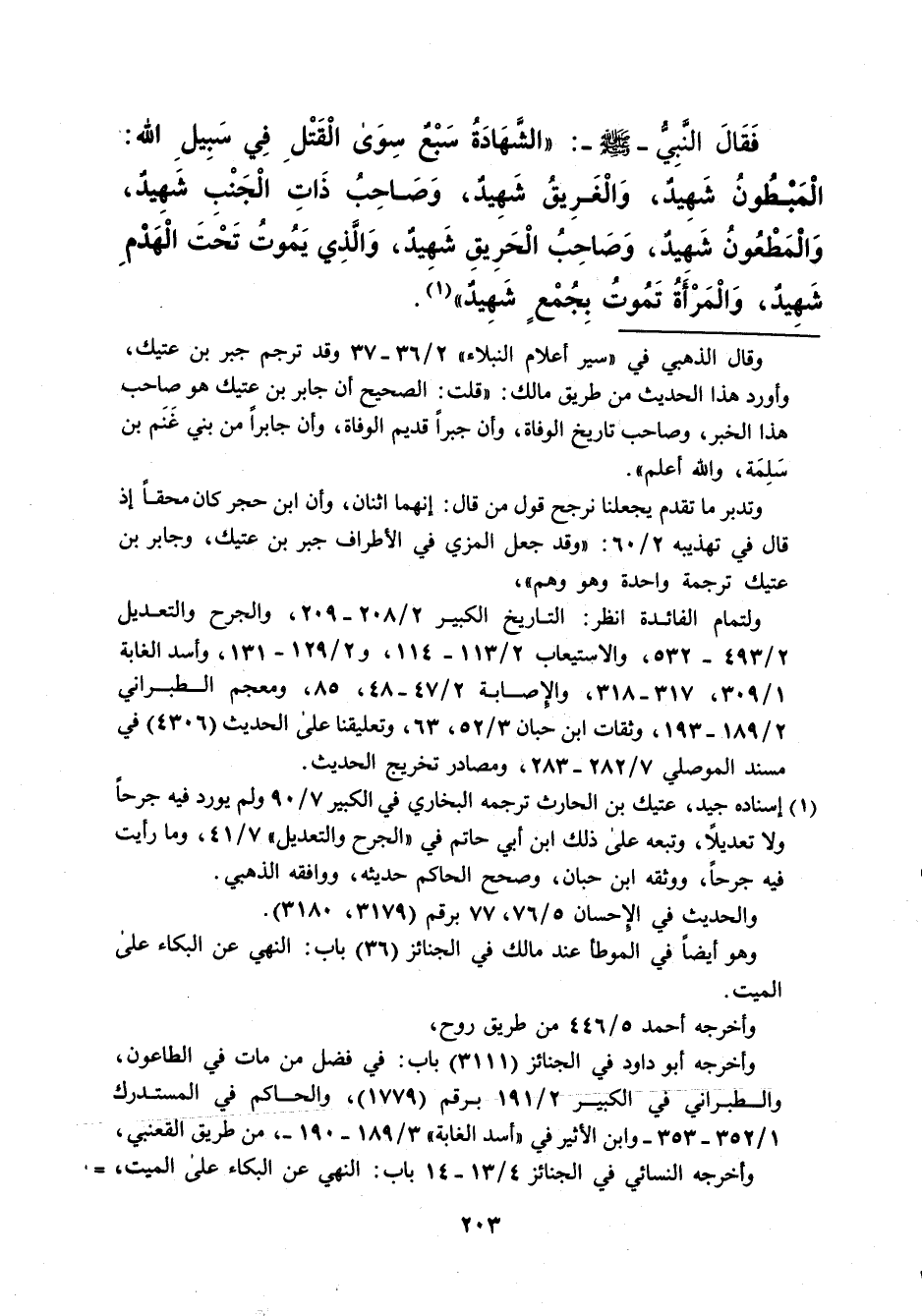 وقال الذهبي في "سير أعلام النبلاء" 2/ 36 - 37 وقد ترجم جبر بن عتيك، وأورد هذا الحديث من طريق مالك: "قلت: الصحيح أن جابر بن عتيك هو صاحب هذا الخبر، وصاحب تاريخ الوفاة، وأن جبراً قديم الوفاة، وأن جابراً من فى غَنَم بن سَلِمَة، والله أعلم".