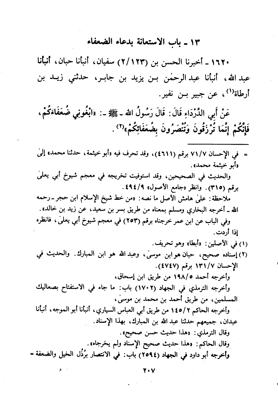 1620 - أخبرنا الحسن بن (123/ 2) سفيان، أنبأنا حبان، أنبأنا ْعبد الله، أنبأنا عبد الرحمن بن يزيد بن جابر، حدثني زيد بن أرطأة (¬1)، عن جبير بن نفير. عَنْ أَبِي الدَّرْدَاءِ قَالَ: قَالَ رَسُولُ الله -صلى الله عليه وسلم-: "ابْغُونِي ضُعَفَاءَكُمْ، فَإنَّكُمْ إِنَّمَا تُرْزَقُونَ وَتُنْصَرُونَ بِضُعَفَائِكُمْ" (¬2).