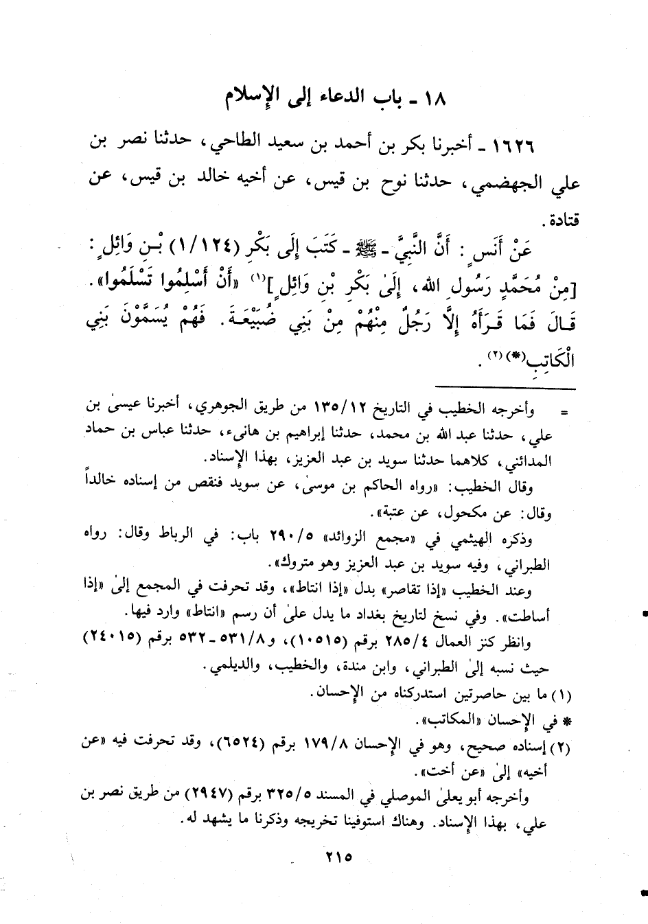 1626 - أخبرنا بكر بن أحمد بن سعيد الطاحي، حدثنا نصر بن علي الجهضمي، حدثنا نوح بن قيس، عن أخيه خالد بن قيس، عن قتادة. عَنْ أَنَسٍ: أَنَّ النَّبِيَّ -صلى الله عليه وسلم- كَتَبَ إِلَى بَكْرِ (124/ 1) بْنِ وَائِلٍ: [مِنْ مُحَمَّدٍ رَسُولِ الله، إِلَى بَكْرِ بْنِ وَائِلٍ] (¬1) "أَنْ أَسْلِمُوا تَسْلَمُوا". قَالَ فَمَا قَرَأَهُ إِلاَّرَجُلٌ مِنْهُمْ مِنْ بَنِي ضُبَيْعَةَ. فَهُمْ يُسَمَّوْنَ بَنِي الْكَاتِبِ (*) (¬2).