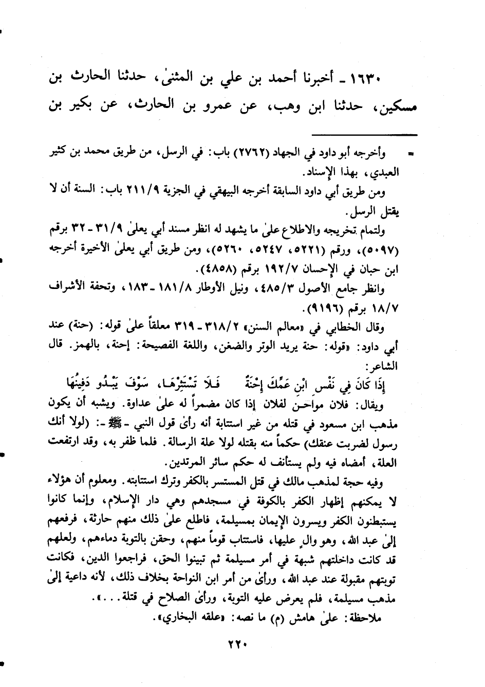 1630 - أخبرنا أحمد بن علي بن المثنى، حدثنا الحارث بن مسكين، حدثنا ابن وهب، عن عمرو بن الحارث، عن بكير بن