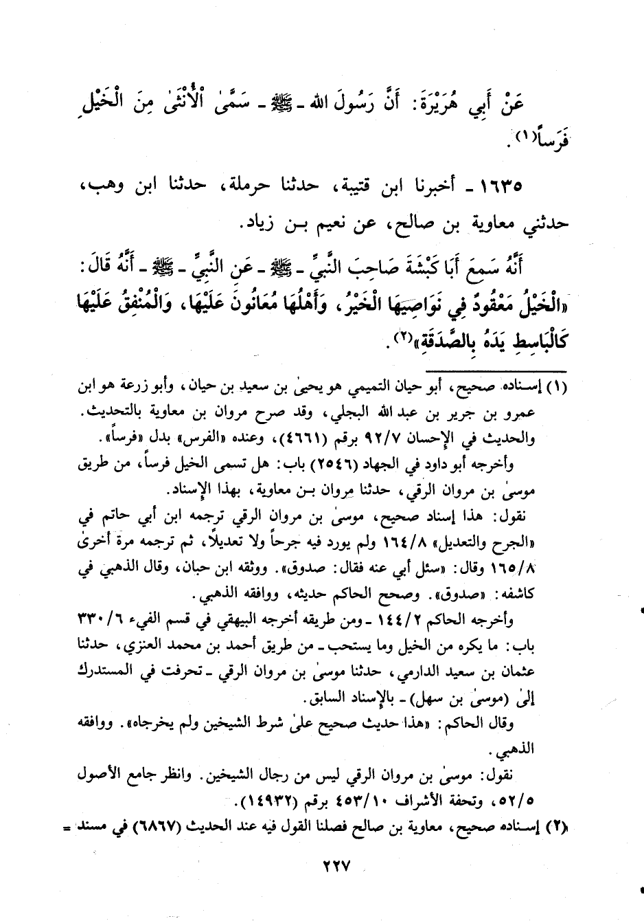 1635 - أخبرنا ابن قتيبة، حدثنا حرملة، حدثنا ابن وهب، حدثني معاوية بن صالح، عن نعيم بن زياد. أَنهُ سَمعَ أَبَا كَبْشَةَ صَاحِبَ النَّبيِّ -صلى الله عليه وسلم-عَنِ النَّبِيِّ -صلى الله عليه وسلم- أَنَّهُ قَالَ: "الْخَيْلُ مَعْقُودٌ فِي نَوَاصِيَهَا الْخَيْرُ، وَأَهْلُهَا مُعَانُونَ عَلَيْهَا، وَالْمُنْفِقُ عَلَيْهَا كالْبَاسِطِ يَدَهُ بِالصَّدَقَةِ" (¬2).