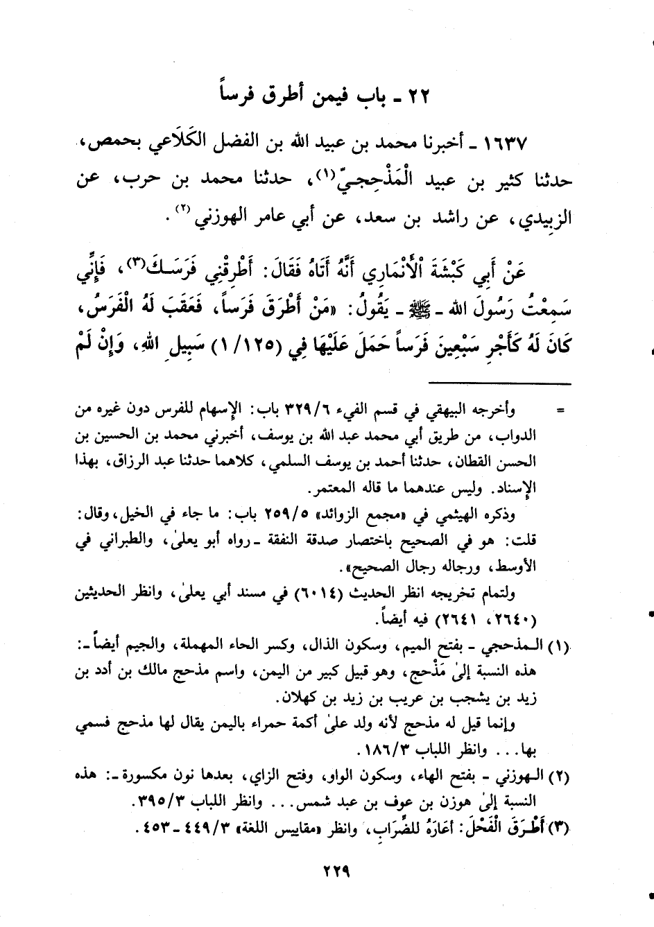 1637 - أخبرنا محمد بن عبيد الله بن الفضل الكَلاَعي بحمص، حدثنا كثير بن عبيد الْمَذْحِجيّ (¬1)، حدثنا محمد بن حرب، عن الزبِيدي، عن راشد بن سعد، عن أبي عامر الهوزني (¬2). عَنْ أَبِي كَبْشَةَ اْلأنْمَارِي أَنَّهُ أَتَاهُ فَقَالَ: أَطْرِقْنِي فَرَسَكَ (¬3)، فَإنِّي سَمِعْتُ رسول الله -صلى الله عليه وسلم- يَقُولُ: "مَنْ أَطْرَقَ فَرَساً، فَعَقَبَ لَهُ الْفَرَسُ، كَانَ لَهُ كَأَجْرِ سَبْعِينَ فَرَساً حَمَلَ عَلَيْهَا فِي (125/ 1) سَبِيلِ اللهِ، وَإنْ لَمْ