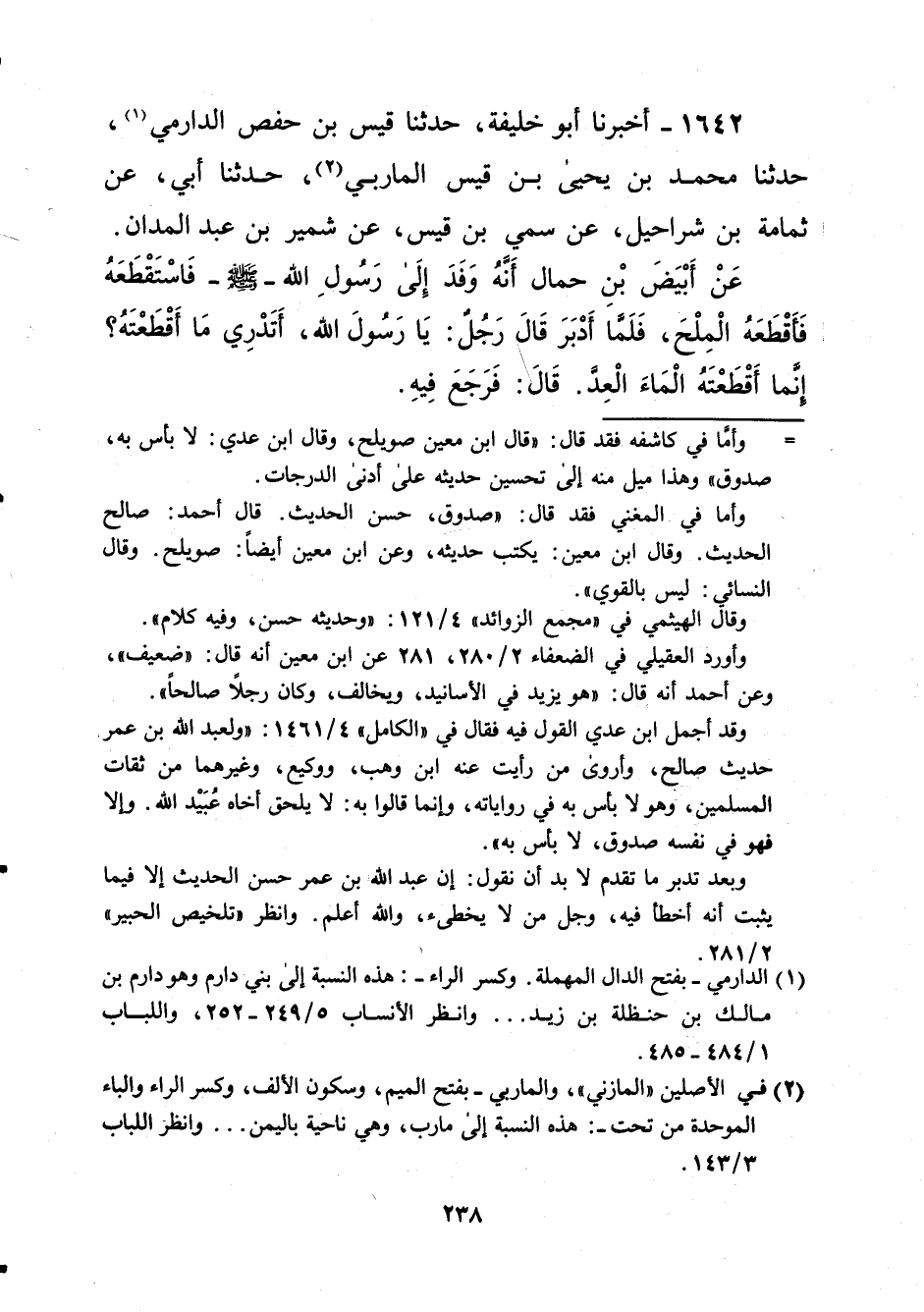 1642 - أخبرنا أبو خليفة، حدثنا قيس بن حفص الدارمي (¬1)، حدثنا محمد بن يحيى بن قيس الماربي (¬2)، حدثنا أبي، عن ثمامة بن شراحيل، عن سميِ بن قيس، عن شمير بن عبد المدان. عَنْ أَبْيَضَ بْنِ حمال أَنَّهُ وَفَدَ إِلَى رَسُولِ الله -صلى الله عليه وسلم- فَاسْتَقْطَعَهُ فَاَقْطَعَهُ الْمِلْحَ، فَلَمَّا أَدْبَرَ قَالَ رَجُلٌ: يَا رسول الله، أَتَدْرِي مَا أَقْطَعْتَهُ؟ إنَّما أَقْطَعْتَهُ الْمَاءَ العِدَّ. قَالَ: فَرَجَعَ فِيهِ.