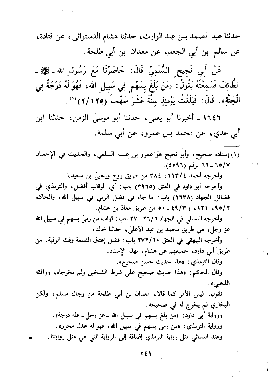 حدثنا عبد الصمد بن عبد الوارث، حدثنا هشام الدستوائي، عن قتادة، عن سالم بن أبي الجعد، عن معدان بن أبي طلحة. عَنْ أَبِي نَجِيحٍ السُّلَمِيّ قَالَ: حَاصَرْنَا مَعَ رَسُولِ الله -صلى الله عليه وسلم- الطَّائِفَ فَسَمِعْتُهُ يَقُولُ: "مَنْ بَلَغَ بِسَهْمٍ فِي سَبِيلِ الله، فَهُوَ لَهُ دَرَجَةٌ فِي الْجَنّةِ". قَالَ: فَبَلَغْتُ يَوْمَئِذٍ سِتةَ عَشَرَ سَهْماً (125/ 2) (¬1).