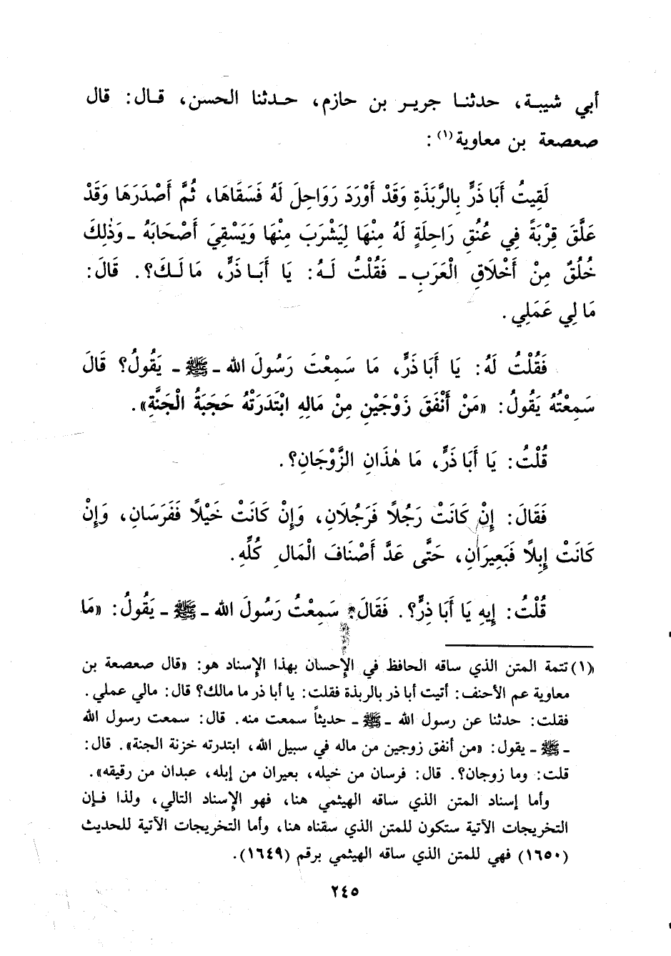(¬1) تتمة المتن الذي ساقه الحافظ في الإحسان بهذا الإسناد هو: "قال صعصعة بن معاوية عم الأحنف: أتيت أبا ذر بالربذة فقلت: يا أبا ذر ما مالك؟ قال: مالي عملي. فقلت: حدثنا عن رسول الله -صلى الله عليه وسلم- حديثاً سمعت منه. قال: سمعت رسول الله -صلى الله عليه وسلم- يقول: "من أنفق زوجين من ماله في سبيل الله، ابتدرته خزنة الجنة". قال: قلت: وما زوجان؟. قال: فرسان من خيله، بعيران من إبله، عبدان من رقيقه".