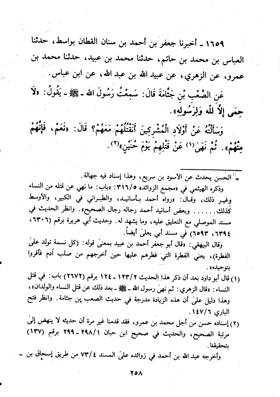 1659 - أخبرنا جعفر بن أحمد بن سنان القطان بواسط، حدثنا العباس بن محمد بن حاتم، حدثنا محمد بن عبيد، حدثنا محمد بن عمرو، عن الزهري، عن عبيد الله بن عبد الله، عن ابن عباس. عَنِ الصَّعب بْنِ جَثَّامَةَ قَالَ: سَمِعْتُ رَسُولَ الله -صلى الله عليه وسلم- يَقُولُ: " لا حِمَى إلاَّ لله ولِرَسُولِهِ". وَسَألْتُهُ عَنْ أَوْلادِ الْمُشْرِكِينَ أَنَقْتُلُهُمْ مَعَهُمْ؟ قَالَ: "نَعَمْ، فَإنَّهُمْ مِنْهُمْ". ثُمَّ نَهَى (¬1) عَنْ قَتْلِهِمْ يَوْمَ حُنَيْنٍ" (¬2).