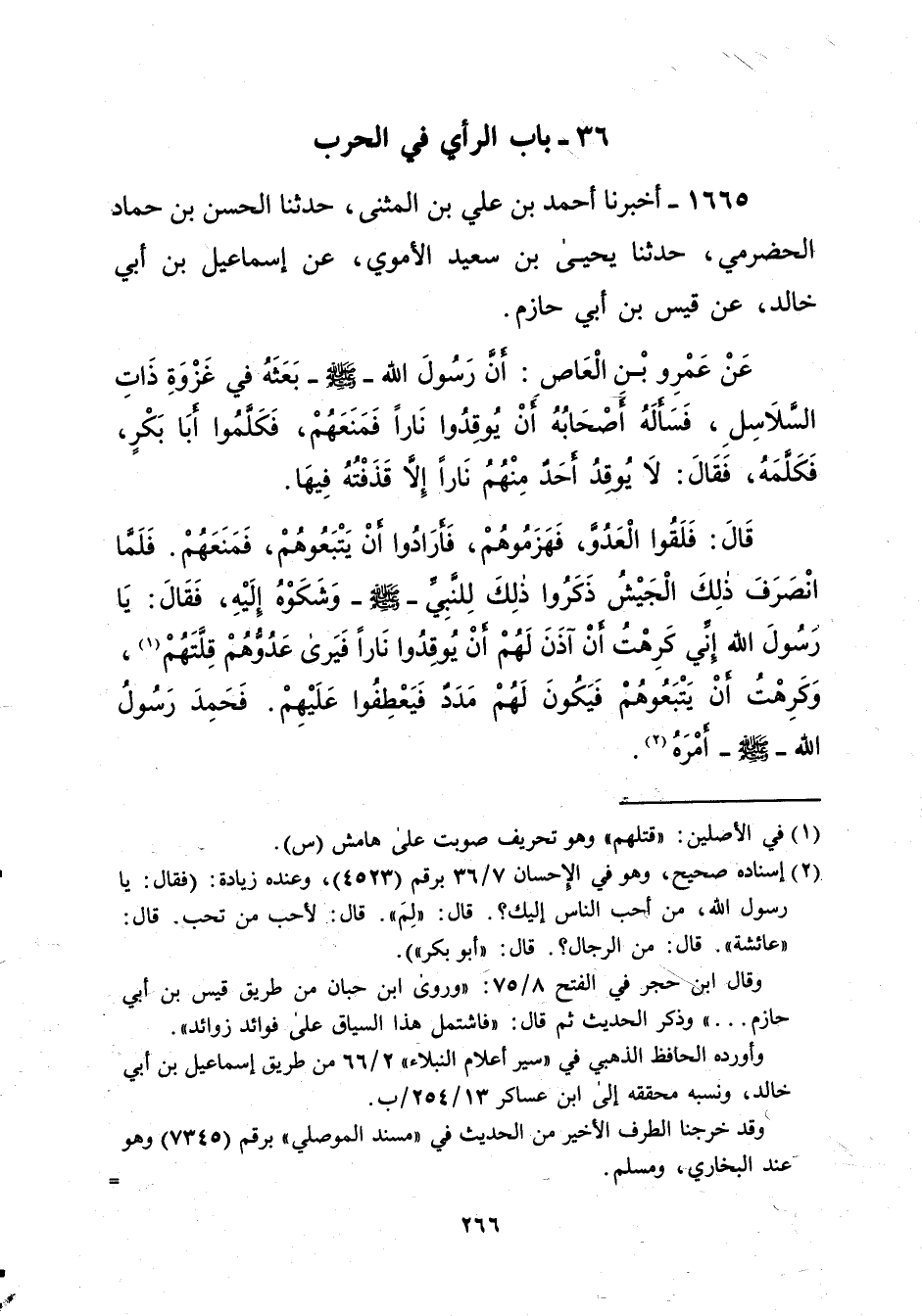1665 - أخبرنا أحمد بن علي بن المثنى، حدثنا الحسن بن حماد الحضرمي، حدثنا يحيى بن سعيد الأموي، عن إسماعيل بن أبي خالد، عن قيس بن أبي حازم. عَنْ عَمْرِو بْن الْعَاص: أنَّ رسُولَ الله -صلى الله عليه وسلم- بعَثَهُ في غَزْوَةِ ذَاتِ السَّلاسل، فَسَألَهُ أَصْحَابُهُ أَنْ يُوقِدُوا نَاراً فَمَنَعَهُمْ، فَكَلَّمُوا أبَا بَكْرٍ، فَكَلَّمَهُ، فَقَالَ: لا يُوقِدُ أحَدٌ مِنْهُمُ نَاراً إِلاَّ قَذَفْتُهُ فِيهَا. قَالَ: فَلَقُوا الْعَدُوَّ، فَهَزَمُوهُمْ، فَأرَادُوا أنْ يَتْبَعُوهُم، فَمَنَعَهُم. فَلَمَّا انْصَرَفَ ذلِكَ الْجَيْشُ ذَكَرُوا ذلِكَ لِلنَّبِيِّ -صلى الله عليه وسلم- وَشَكَوْهُ إلَيْهِ، فَقَالَ: يَا رَسُولَ الله إنِّي كَرِهْتُ أن آذَنَ لَهُمْ أنْ يُوقِدُوا نَاراً فَيَرى عَدُوُّهُمْ قِلَّتَهُمْ (¬1)، وَكَرِهْتُ أنْ يَتْبَعُوهُم فَيَكُونَ لَهُم مَدَدٌ فَيَعْطِفُوا عَلَيْهِمْ. فَحَمِدَ رَسُولُ الله -صلى الله عليه وسلم- أمْرَهُ (¬2).