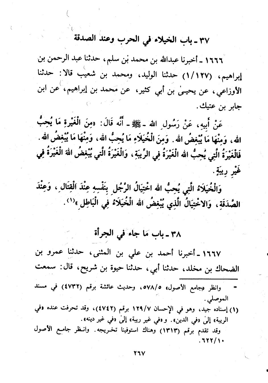 1666 - أخبرنا عبد الله بن محمد بن سلم، حدثنا عبد الرحمن بن إبراهيم، (127/ 1) حدثنا الوليد، ومحمد بن شعيب قالا: حدثنا الأوزاعي، عن يحيى بن أبي كثير، عن محمد بن إبراهيم، عن ابن جابر بن عتيك. عَنْ أبِيهِ، عَنْ رَسُولِ الله -صلى الله عليه وسلم- أنَّه قَالَ:" مِنَ الْغَيْرةِ مَا يُحِبُّ الله، وَمِنْهَا مَا يُبْغِضُ الله. وَمِنَ الْخُيَلاءِ مَا يُحب الله، وَمِنْهَا مَا يُبْغِضُ الله. فالْغَيْرَةُ التِي يُحِبًّ الله الْغَيْرَةُ فِي الرِّيبَةِ، وَالْغَيْرَةُ التى يُبْغِض اللهُ الْغَيْرَةُ فِي غيْرِ رِيبَةٍ. وَالْخُيَلاءُ التِي يُحِبُّ الله اخْتِيَالُ الرُّجُلِ بِنَفْسِهِ عِنْدَ القتَالِ، وَعِنْدَ الصَّدَقَةِ، وَالاخْتِيَالُ الذِي يُبْغِضُ الله الْخُيَلاءُ فِي الْبَاطِلِ" (¬1).