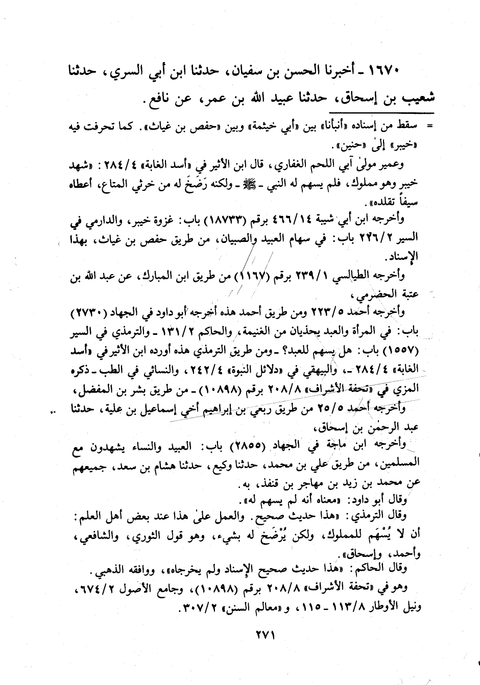 1670 - أخبرنا الحسن بن سفيان، حدثنا ابن أبي السري، حدثنا شعيب بن إسحاق، حدثنا عبيد الله بن عمر، عن نافع.