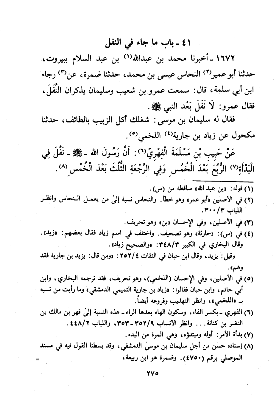 1672 - أخبرنا محمد بن عبد الله (¬1) بن عبد السلام ببيروت، حدثنا أبو عمير (¬2) النحاس عيسى بن محمد، حدثنا ضمرة، عن (¬3) رجاء ابن أبي سلمة، قال: سمعت عمرو بن شعيب وسليمان يذكران النَّفَلَ، فقال عمرو: لا نَفَلَ بَعْد النبي -صلى الله عليه وسلم-. فقال له سليمان بن موسى: شغلك أكل الزبيب بالطائف، حدثنا مكحول عن زياد بن جارية (¬4) اللخمي (¬5). عَن حَبِيب بْنِ مَسْلَمَةَ الْفِهْرِيّ (¬6): أَنَّ رسول الله -صلى الله عليه وسلم- نَفَّلَ فِي الْبَدْأَةِ (¬7) الرُّبُعَ بعْدَ الْخُمُسِ وَفِى الرَّجعة الثُّلُثَ بَعْدَ الْخُمُسِ (¬8).