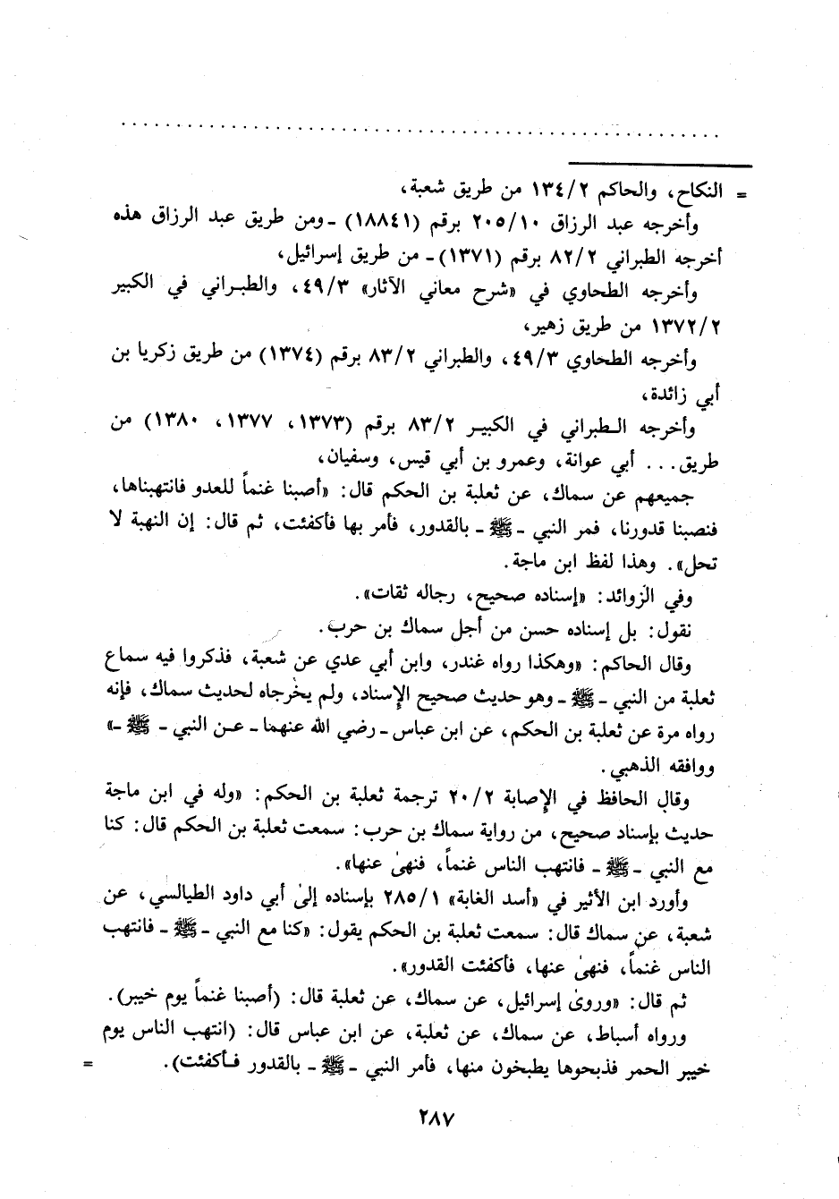 وقال الحافظ في الإصابة 2/ 20 ترجمة ثعلبة بن الحكم: "وله في ابن ماجة حديث بإسناد صحيح، من رواية سماك بن حرب: سمعت ثعلبة بن الحكم قال: كنا مع النبي -صلى الله عليه وسلم- فانتهب الناس غنماً، فنهى عنها".